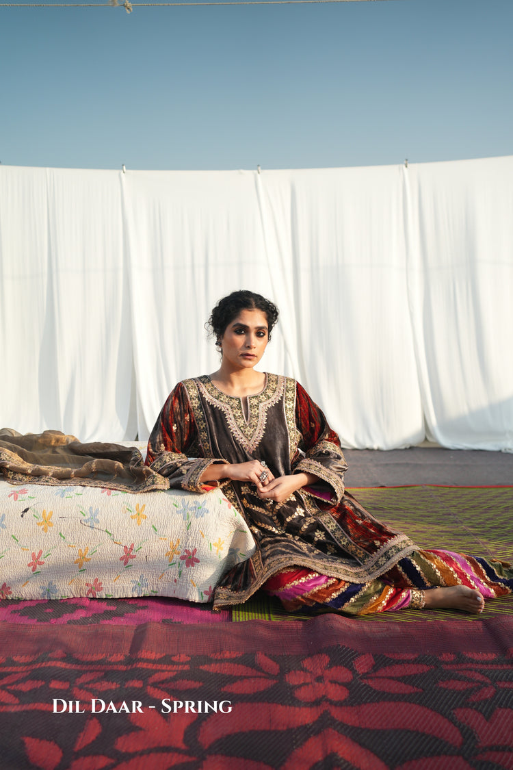 KURTA - Pink-Purple Tie-Dye Chanderi ChogaBOTTOM - Multi-Stripe Silk Velvet GararaODHANI - Multi-Stripe TissueEMBROIDERY- Zari AriNO OF COMPONENT - 3 PcsThis choga set features a pink-purple tie-dye chanderi choga kurta paired with a multi-stripe silk velvet garara and a matching multi-stripe tissue odhani, creating...