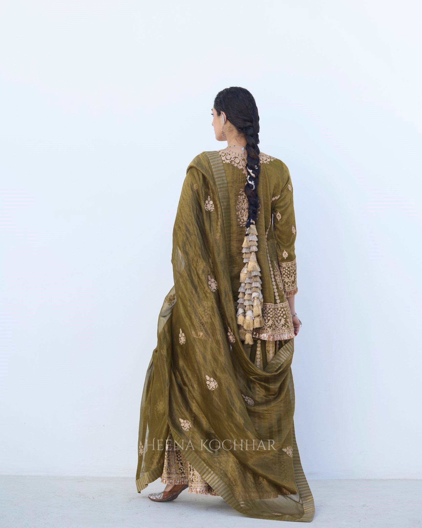 KURTA- OLIVE GREEN TISSUE PRINCESS KURTA