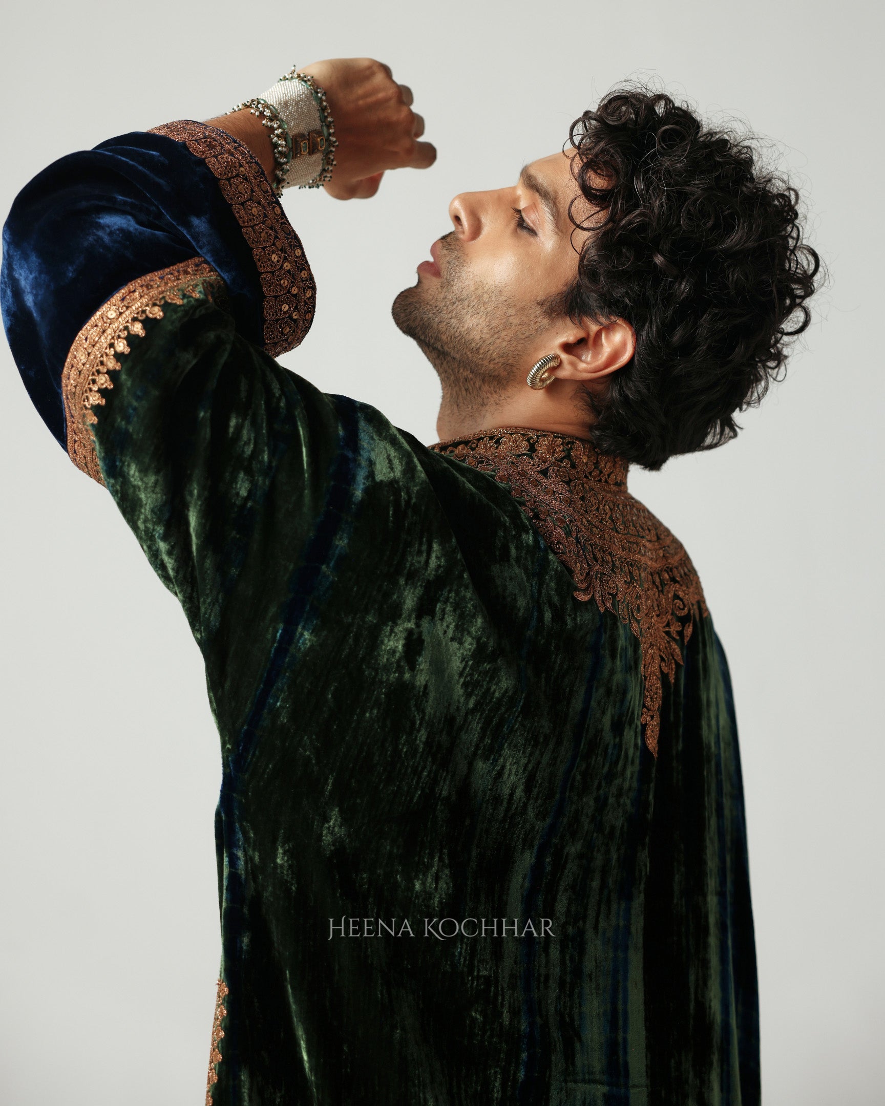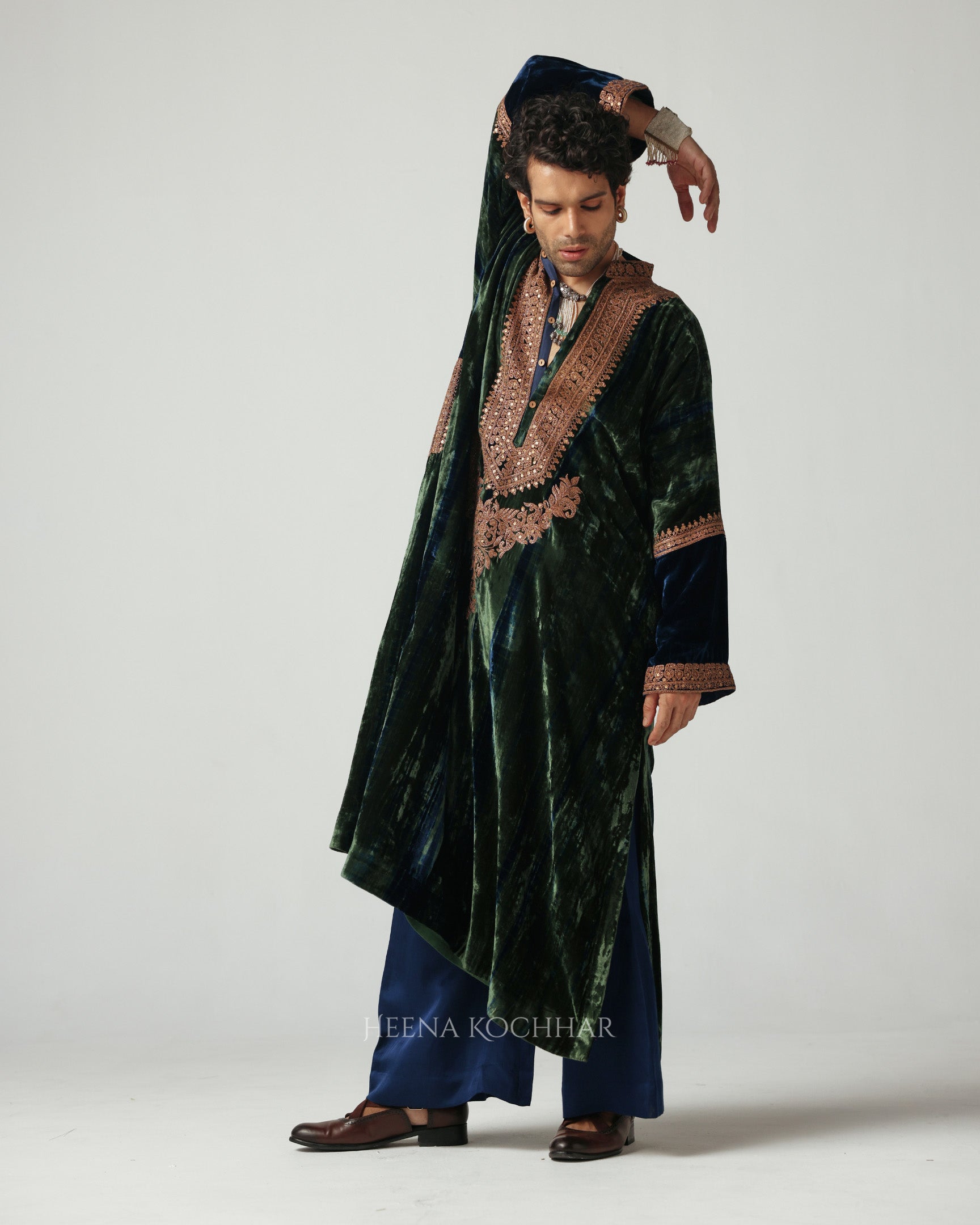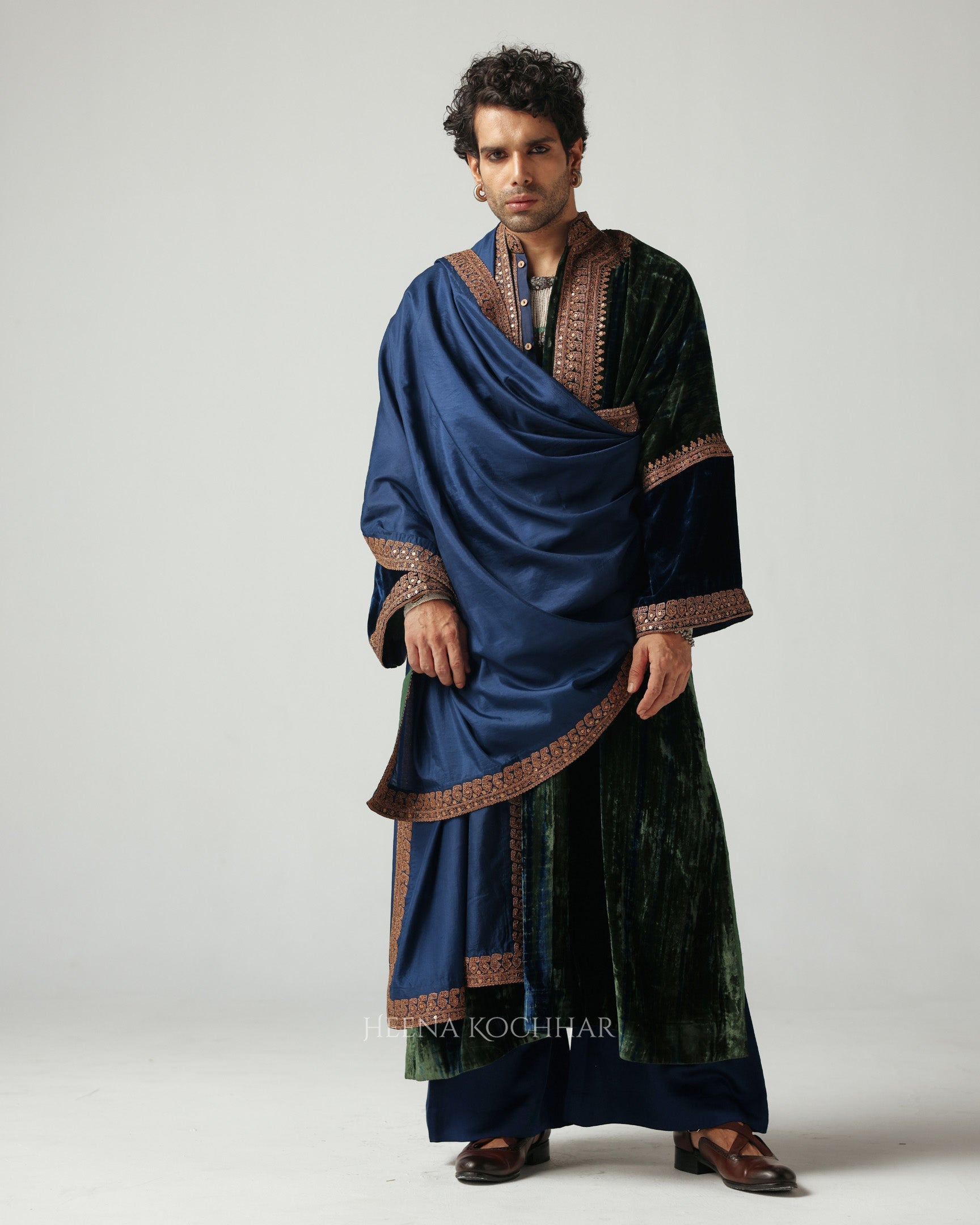 This green and blue tie-dye velvet choga stands out for its subtle elegance and rich tonal play. The surface is detailed with dori and sitara embroidery, adding a gentle shimmer that enhances the festive charm of the piece.