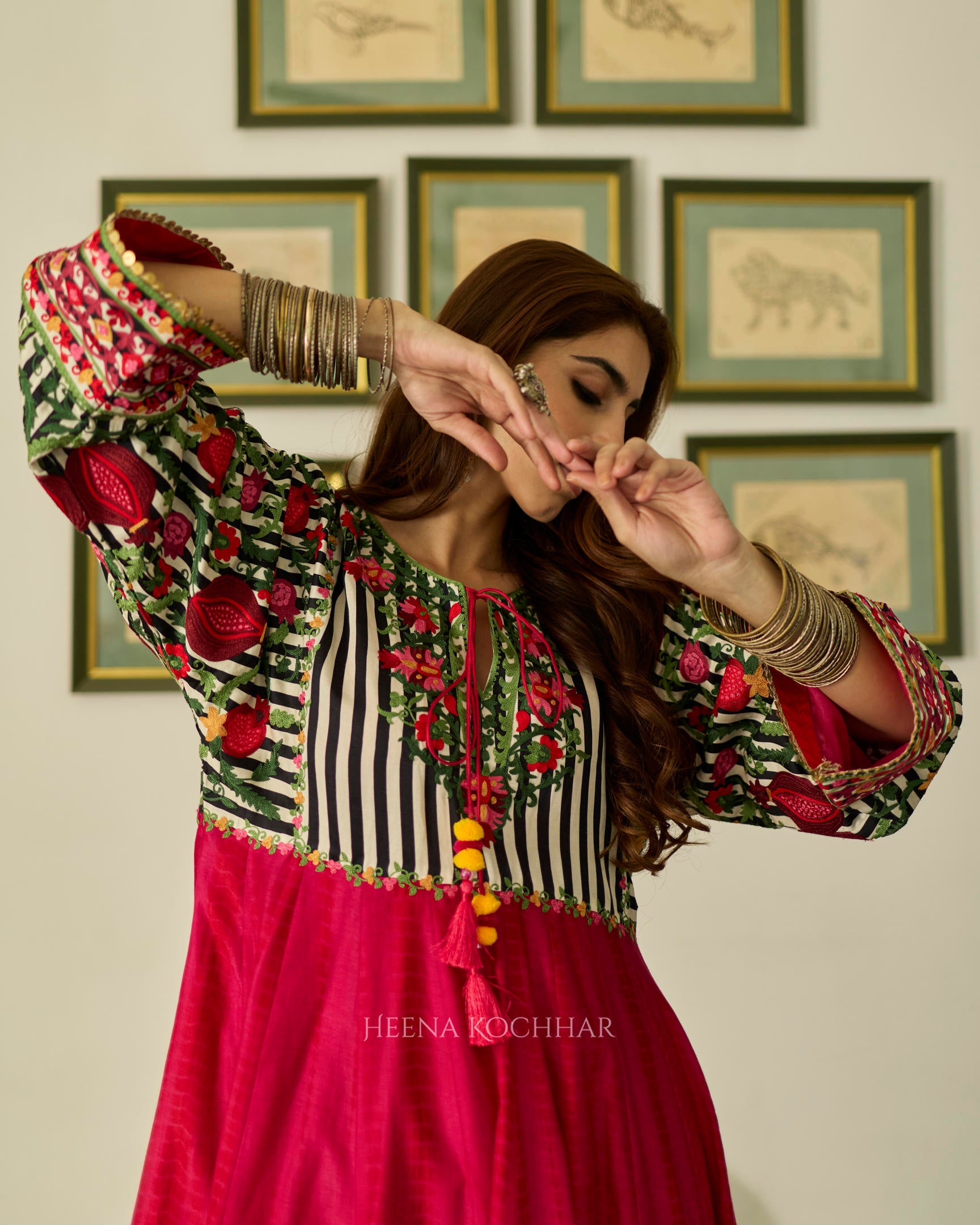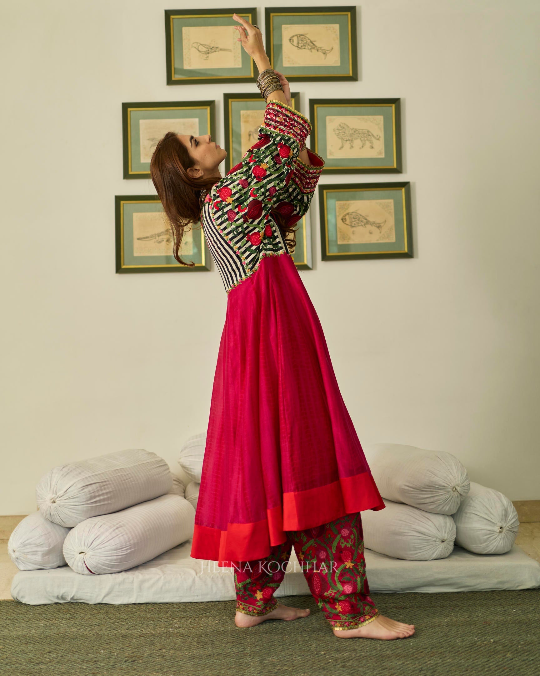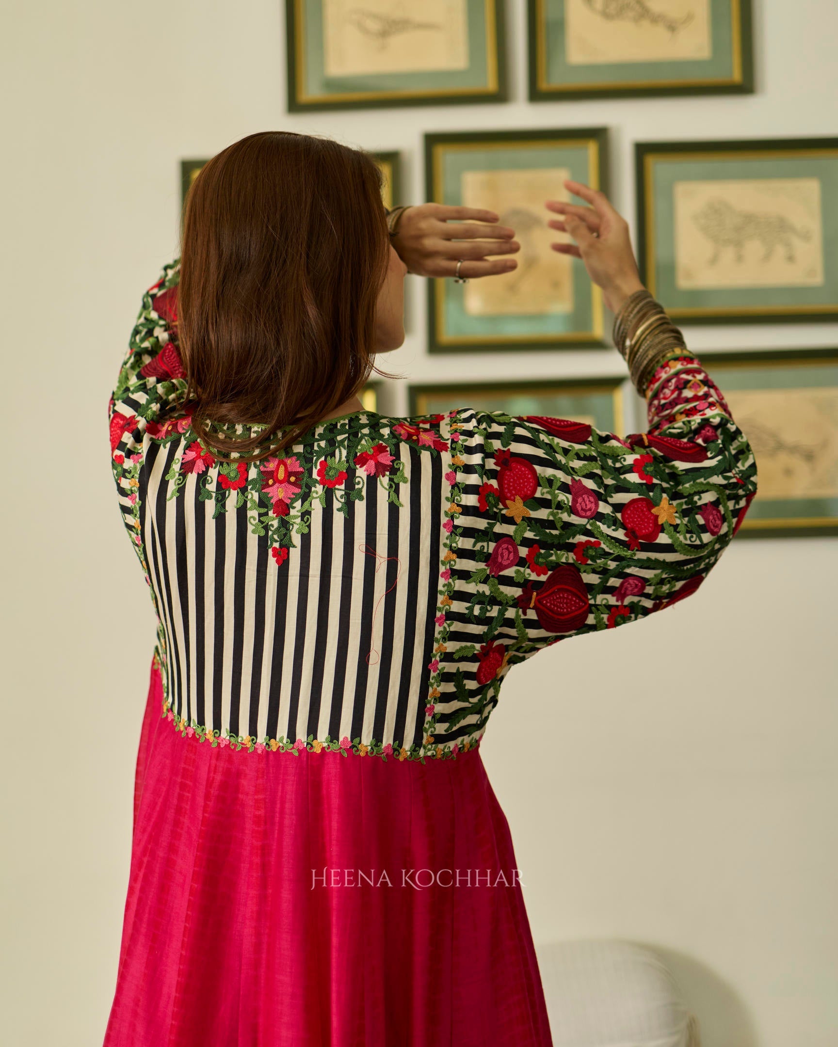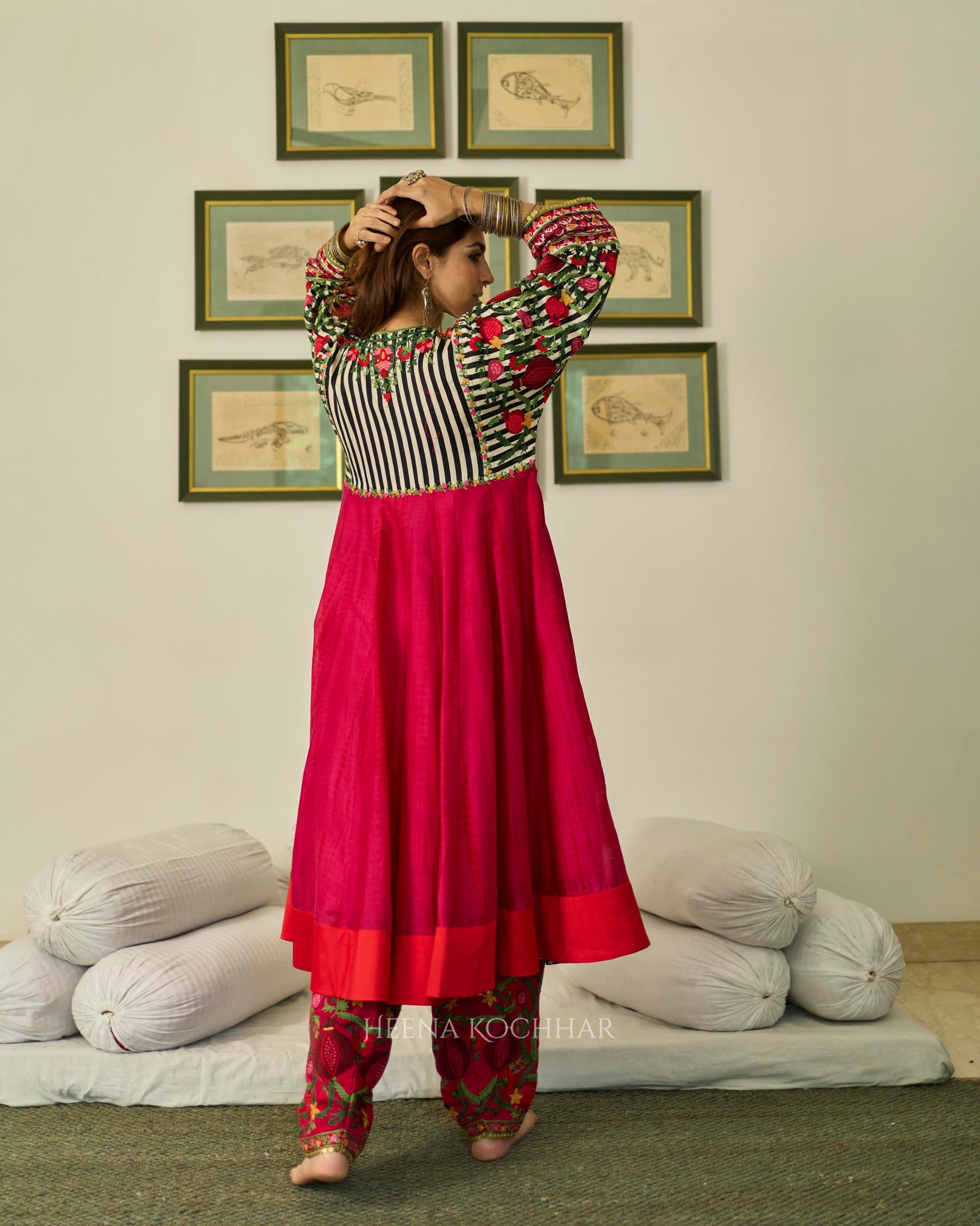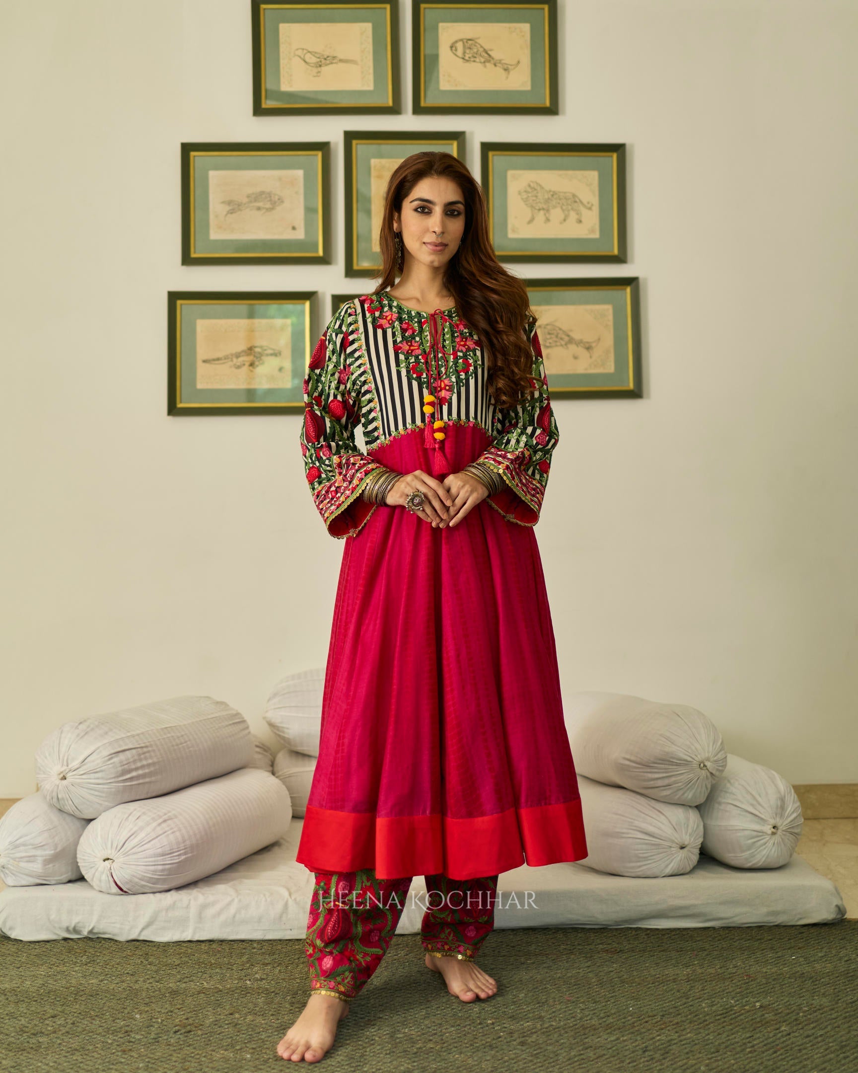 KURTA - Red Rani Tie-dye Chanderi Stripe Anarkali