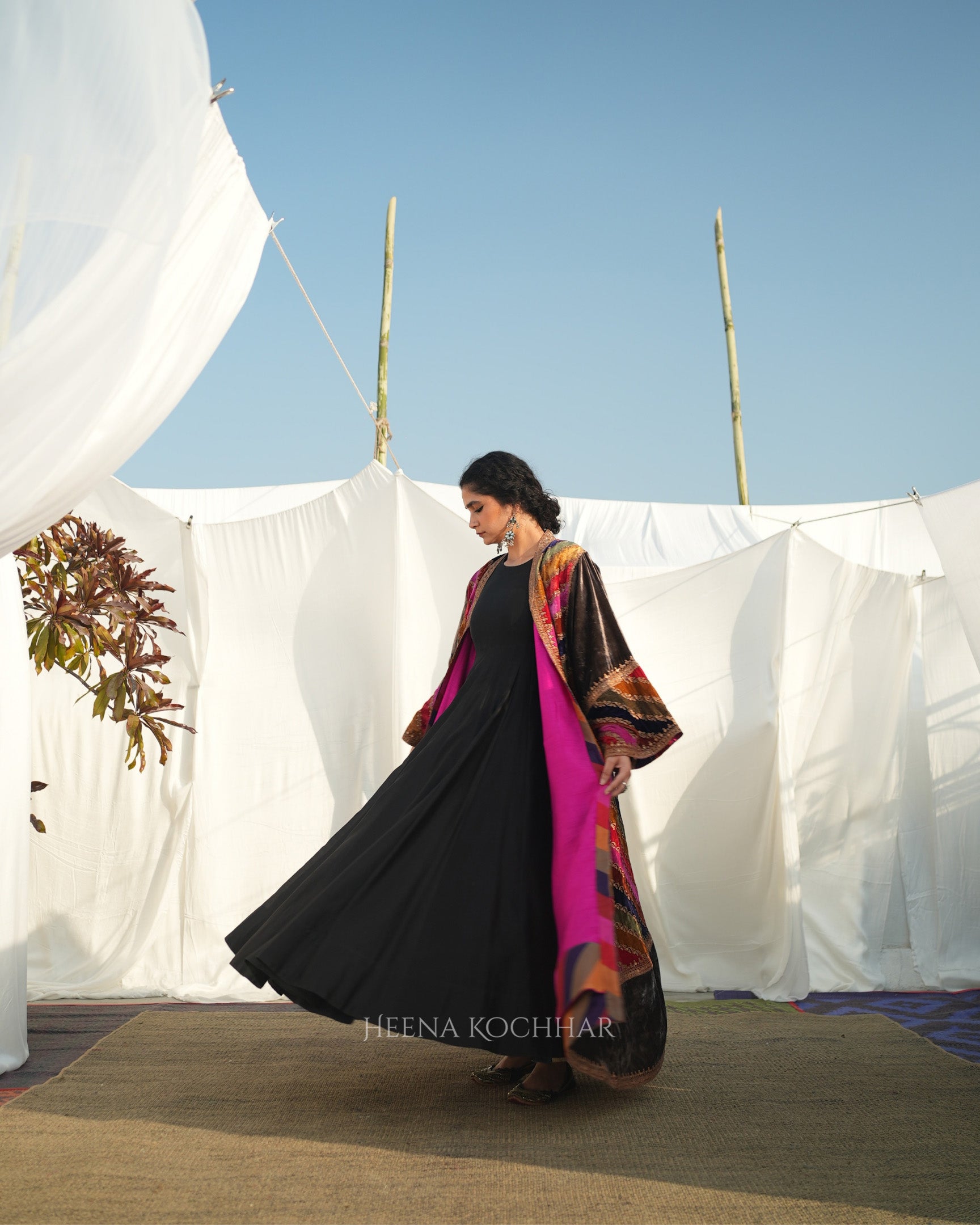 This silk velvet cape features clay and multi stripe panels crafted in silk velvet, creating a rich and textured look. Finished with zari dori embroidery, the cape highlights traditional craftsmanship with refined surface detail.