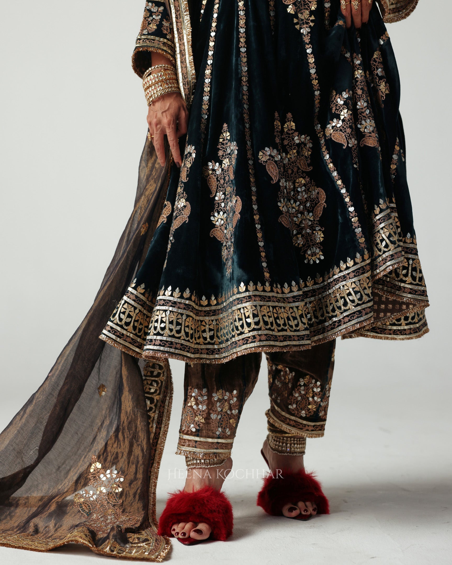 A rich teal velvet Anarkali, crafted with contrasting patches that add depth and texture to the silhouette. The piece is delicately embroidered in gota aari, lending a subtle shimmer that enhances its festive appeal.
