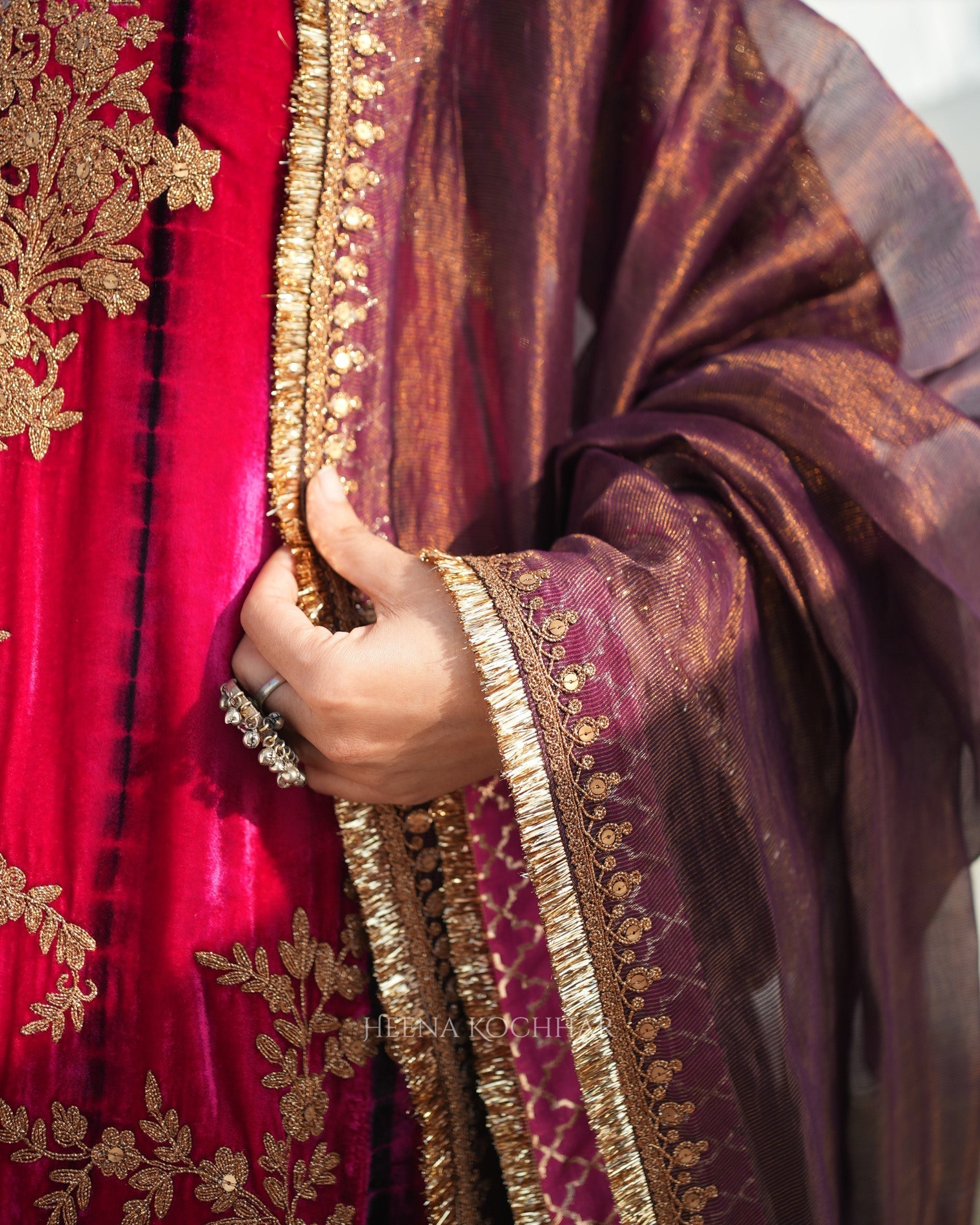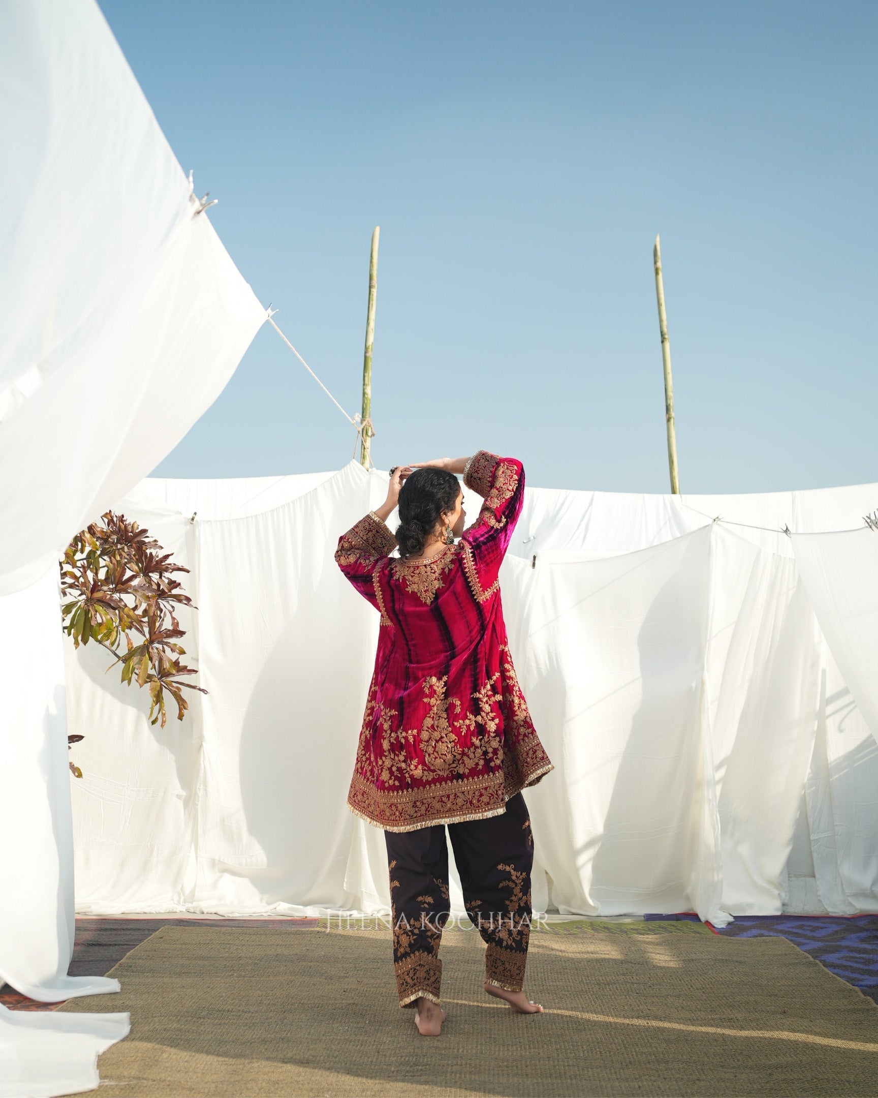 This choga set features a pink and purple tie-dye silk velvet choga kurta paired with a purple silk salwar and a purple weave tissue odhani, creating a coordinated festive look. The tie-dye surface and rich tones add depth to the ensemble. Finished with zari dori embroidery, the set highlights traditional craftsmanship with refined surface detail.