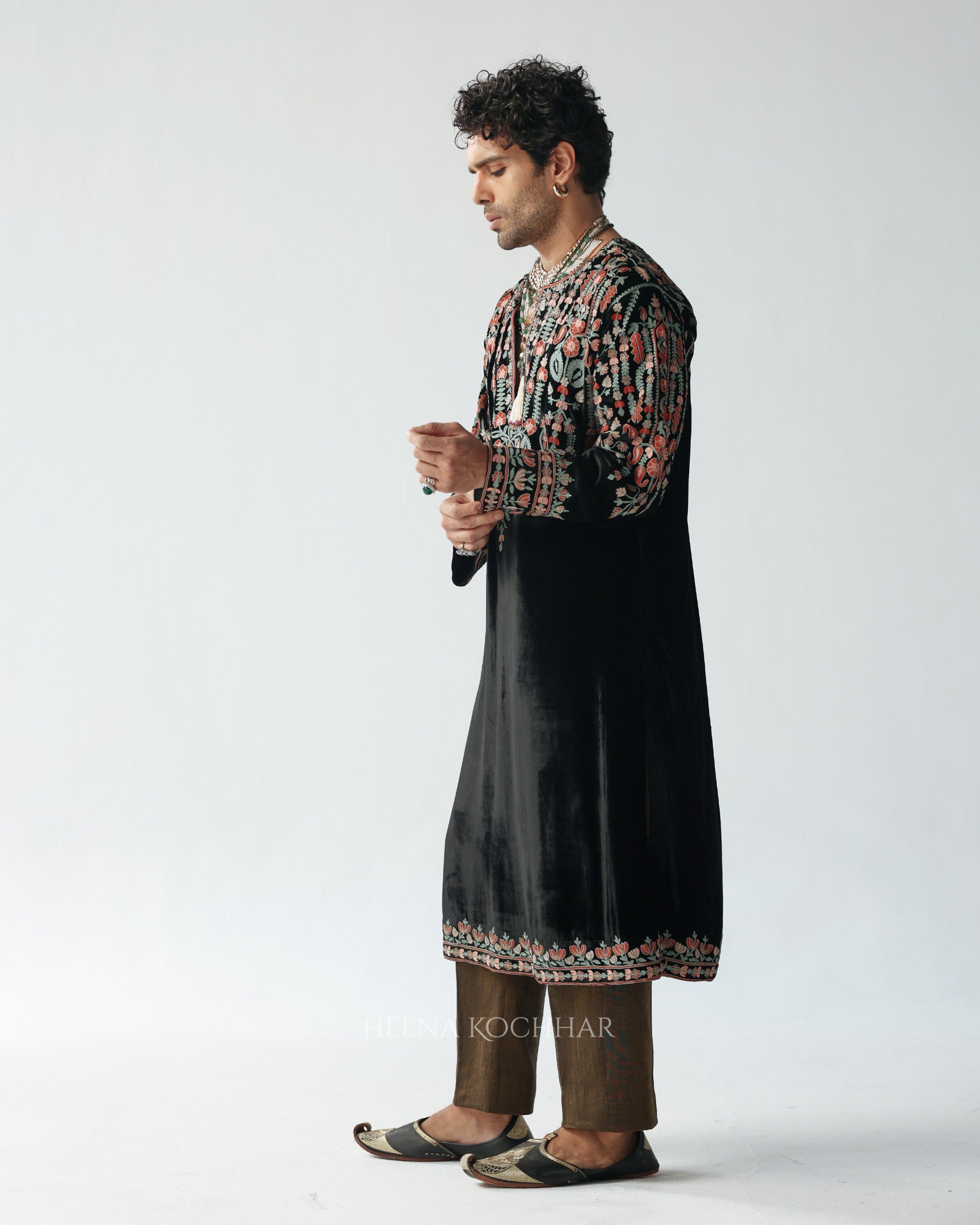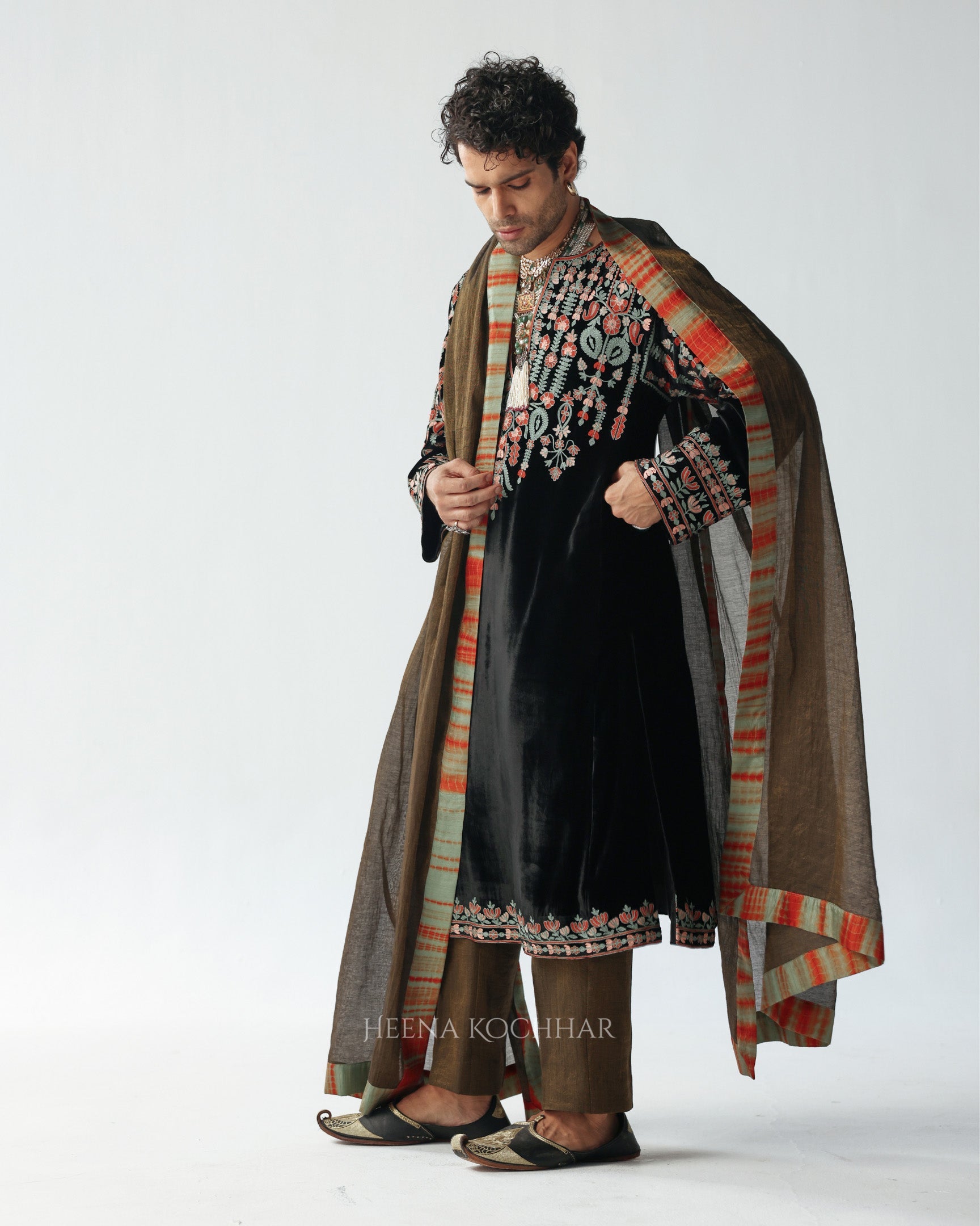 This black velvet choga features multi-resham ari embroidery, adding subtle color and detail against the deep velvet base.