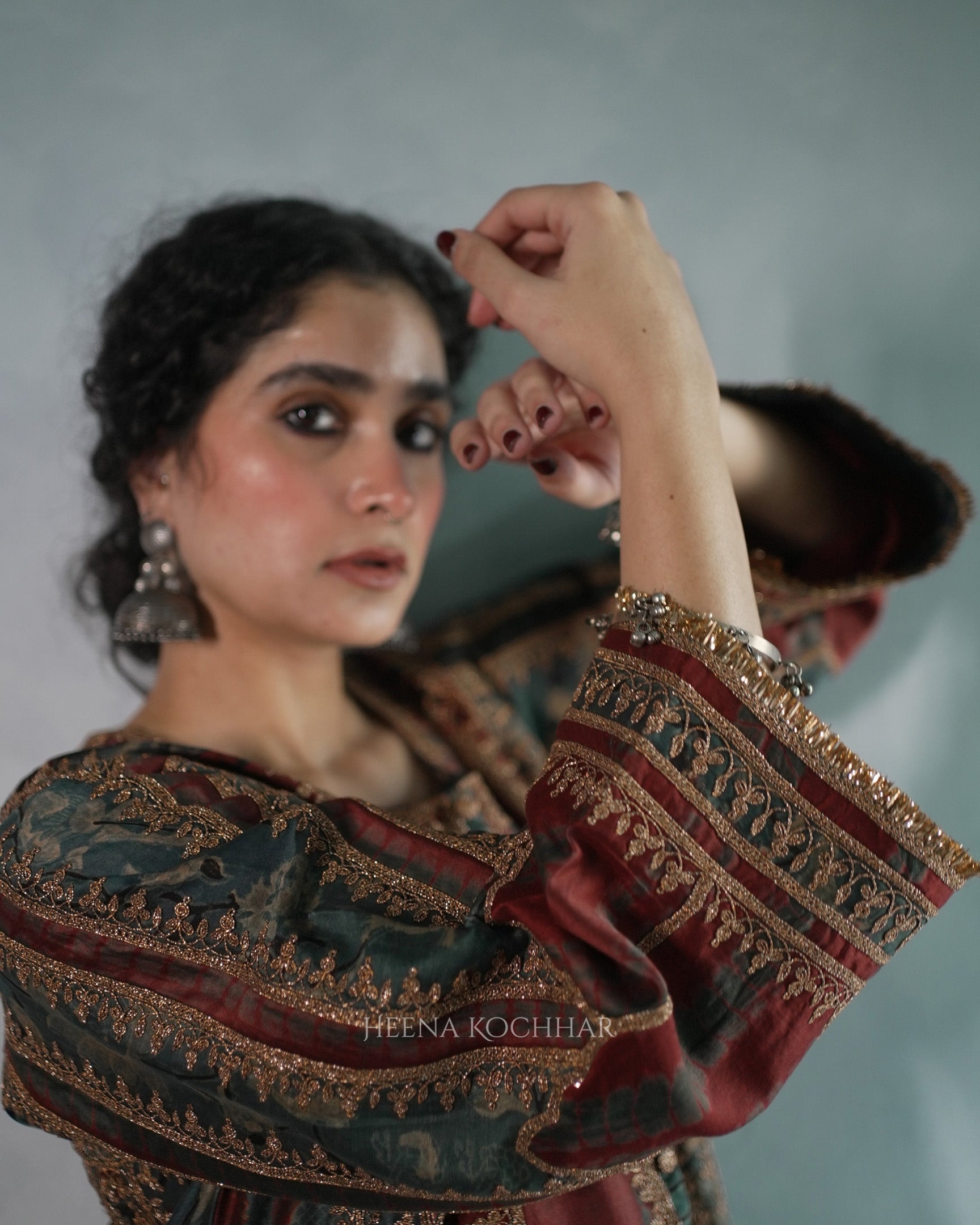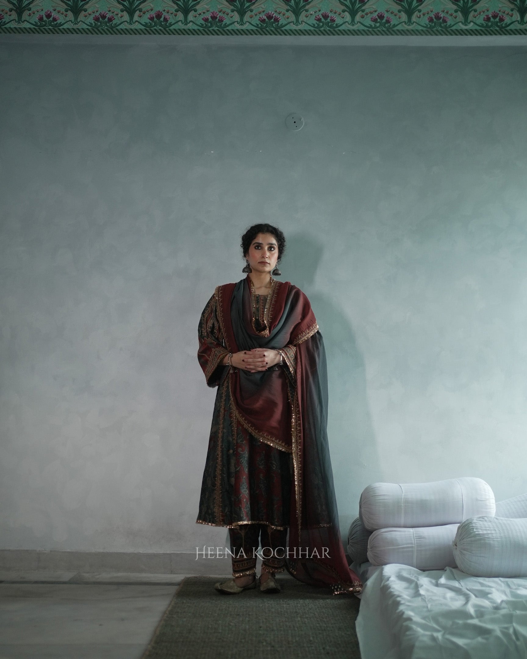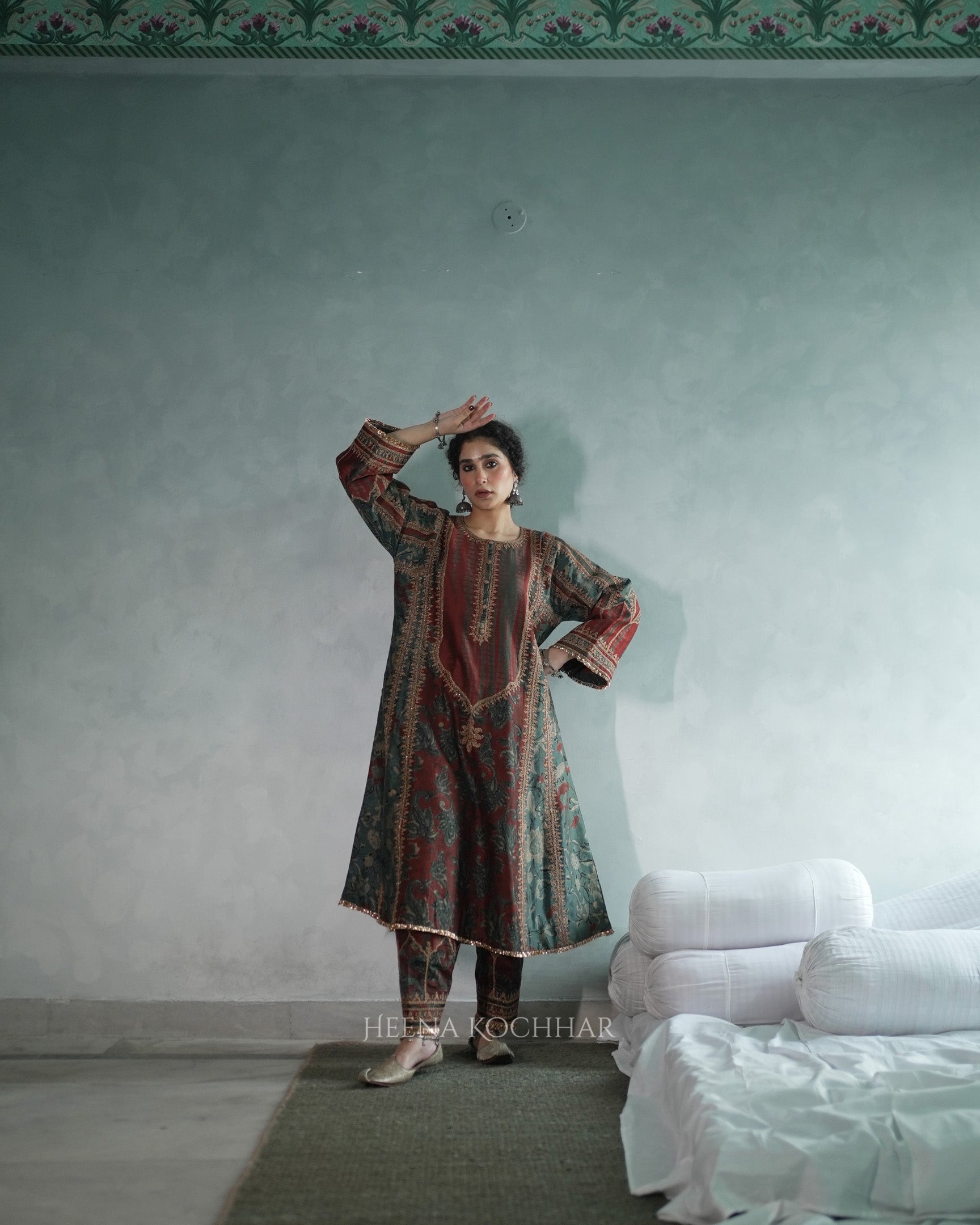 KURTA - Maroon And Green Ajrakh Chanderi Choga