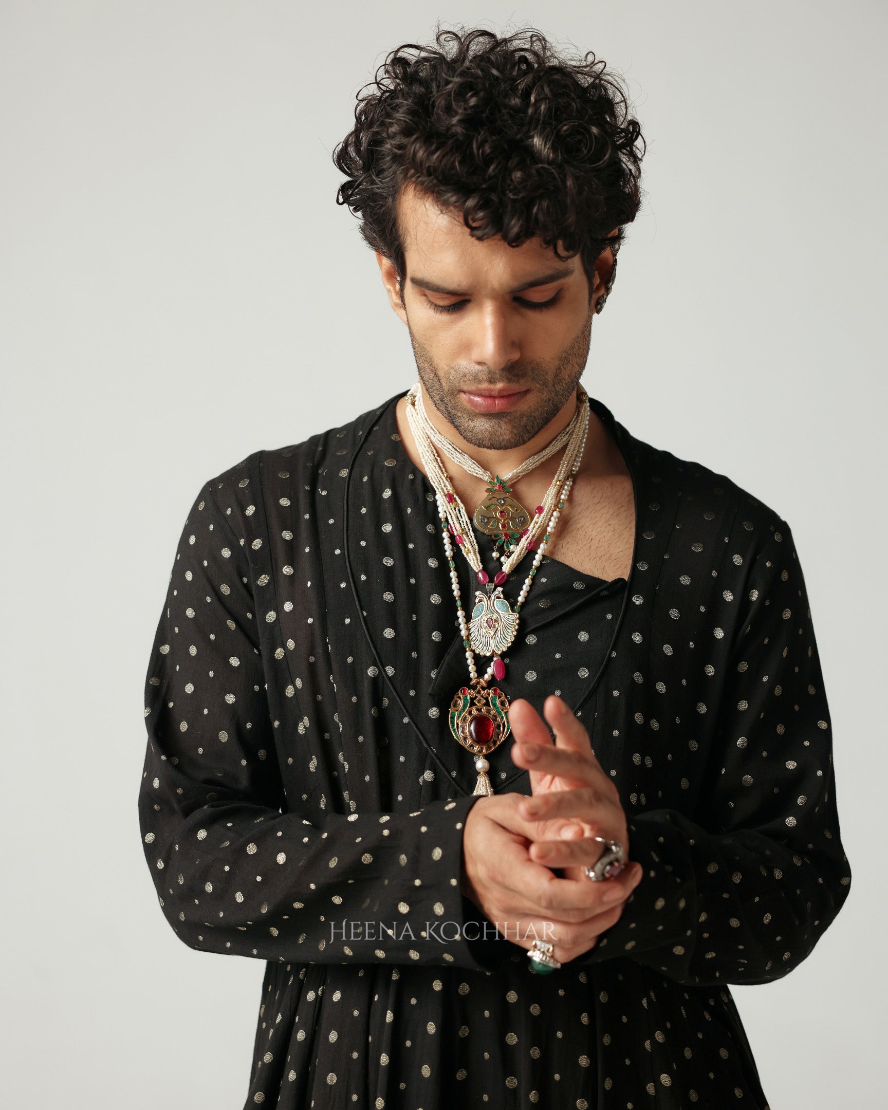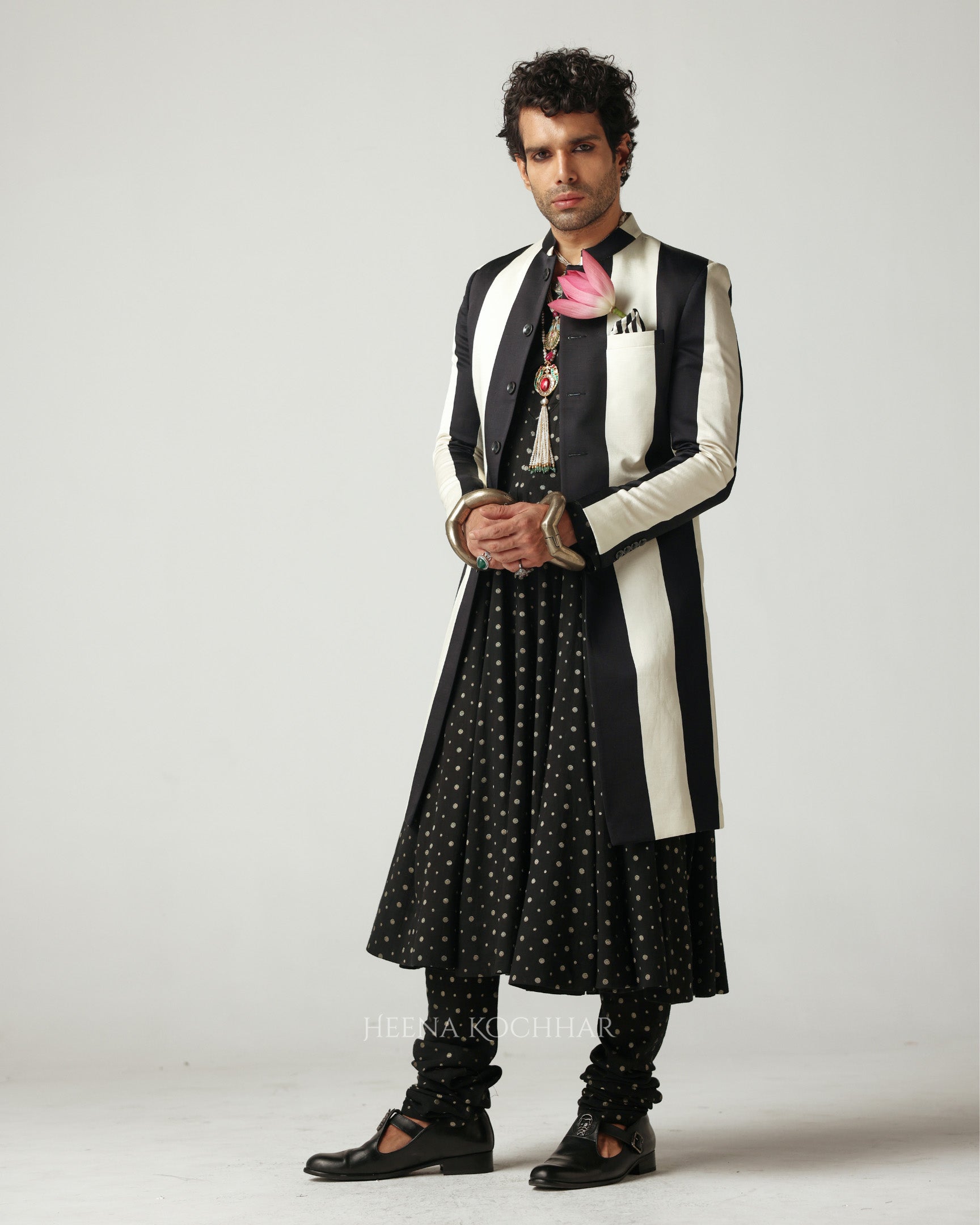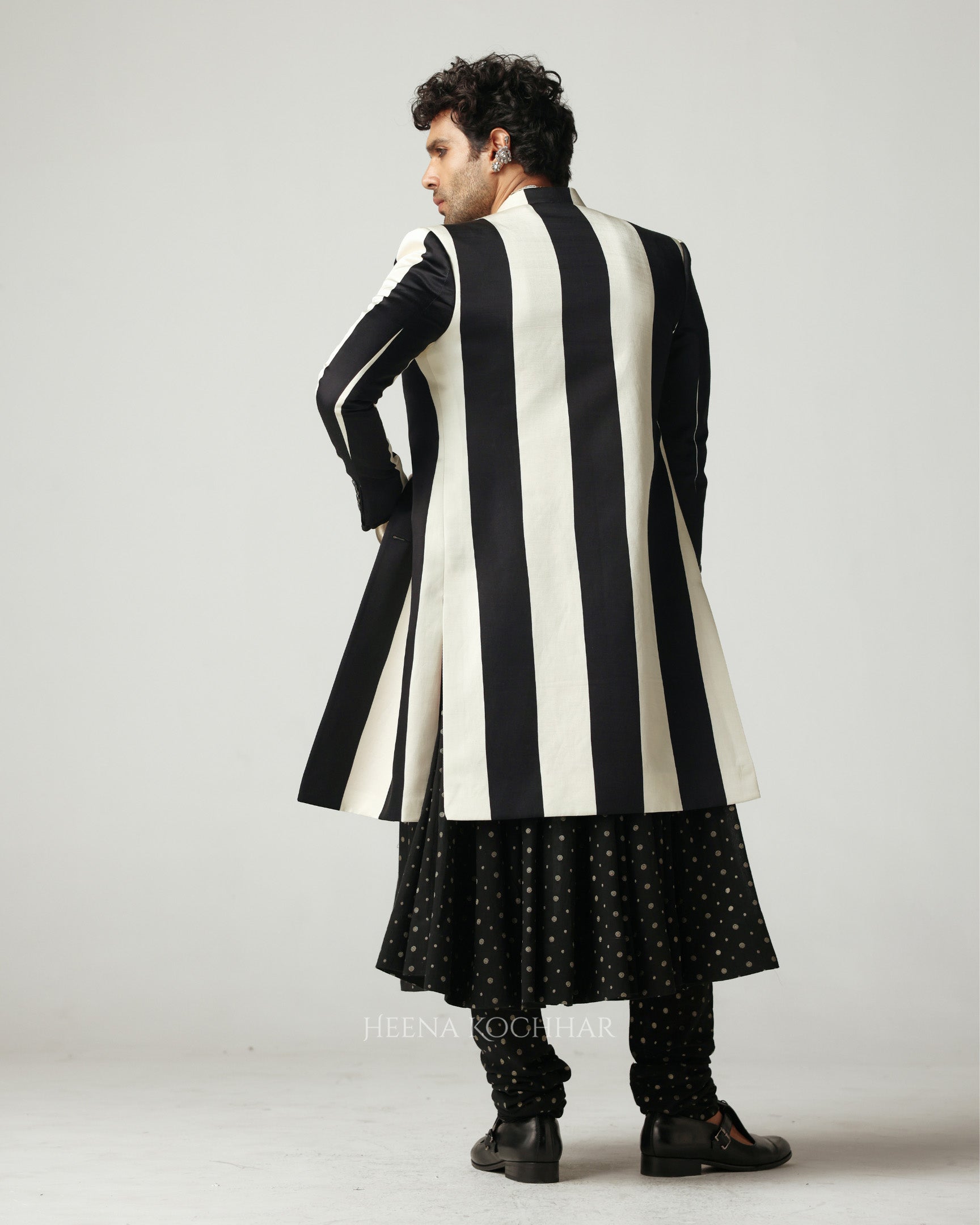 Tailored in linen, this black and white striped sherwani redefines classic form with contemporary restraint. It is lined with contrasting pink silk.The structure commands quiet presence, while the interplay of stripes lends rhythm and modernity to the traditional silhouette.