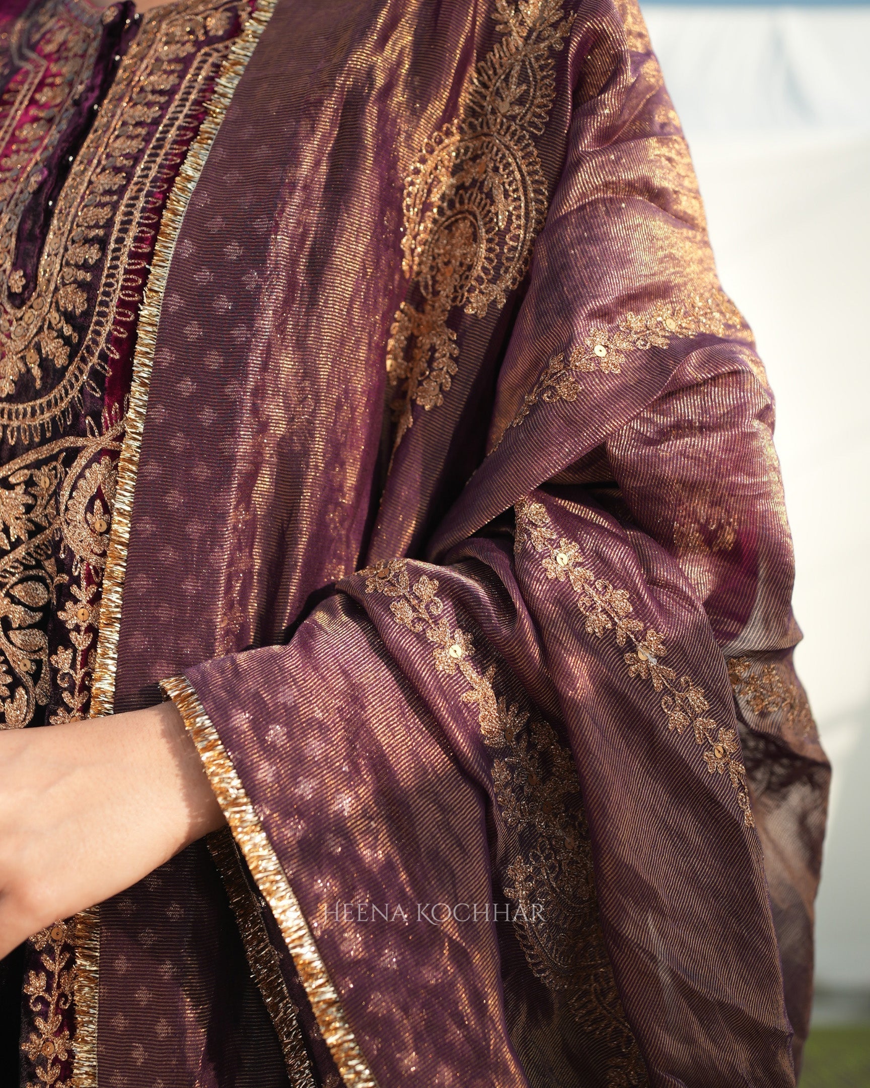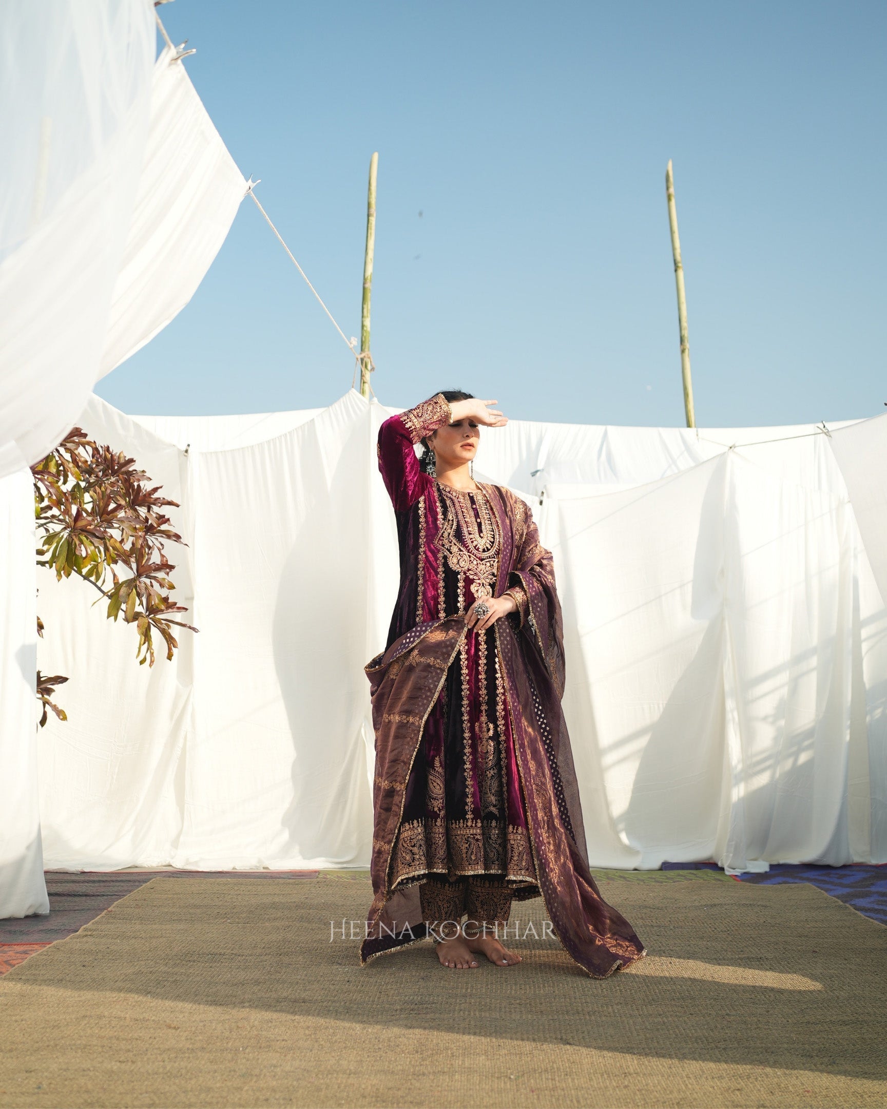 This anarkali set features a pink and purple silk velvet anarkali kurta paired with a purple silk velvet salwar and a purple weave tissue odhani, creating a coordinated festive look. The rich velvet texture and tonal palette add depth to the ensemble. Finished with zari ari sitara embroidery, the set highlights fine craftsmanship with refined surface detail.