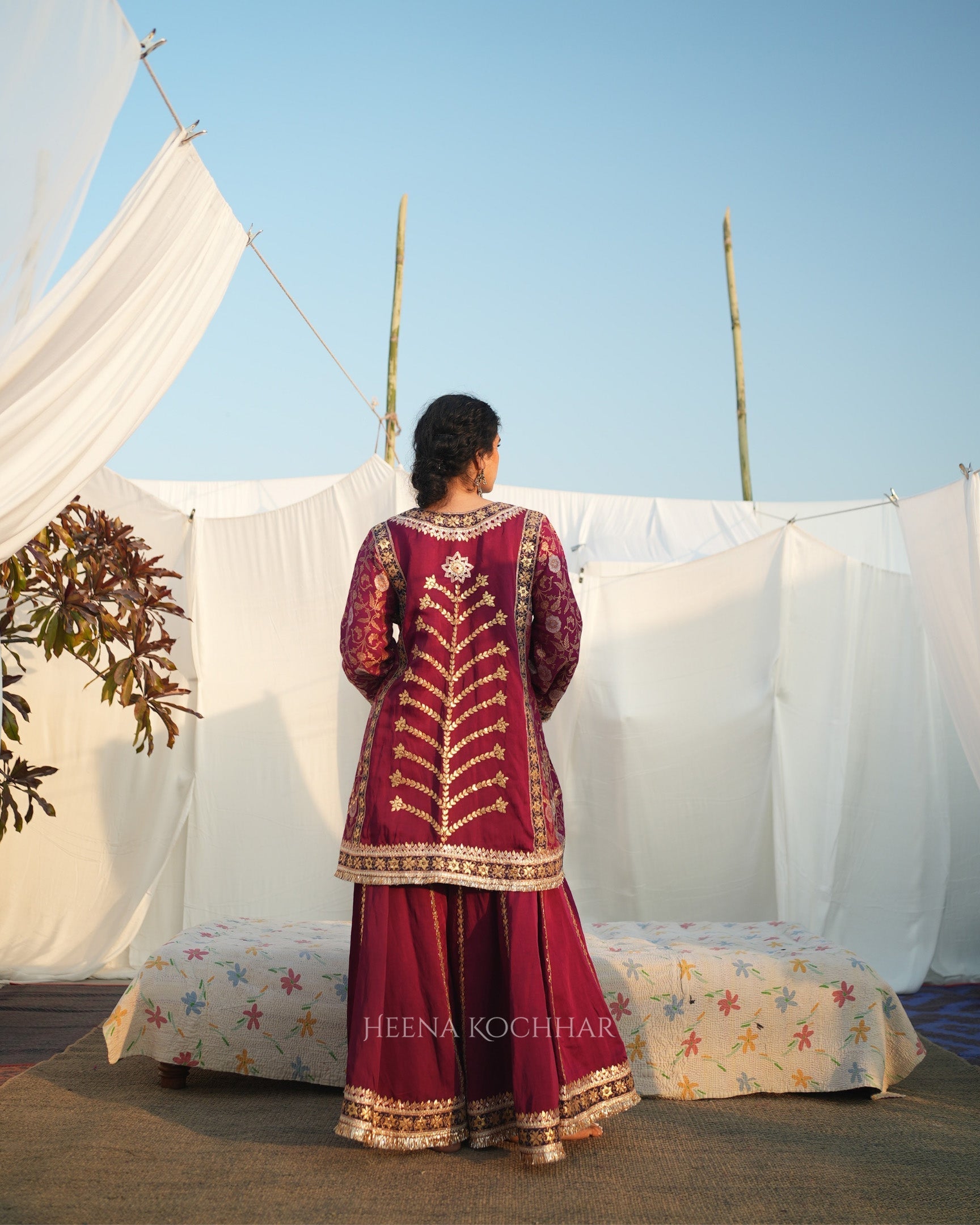 This choga set features a pink monga silk choga kurta paired with a pink silk linen sharara and a purple weave tissue odhani, creating a vibrant and coordinated festive look. Finished with gota ari embroidery, the set highlights traditional craftsmanship with refined surface detail.