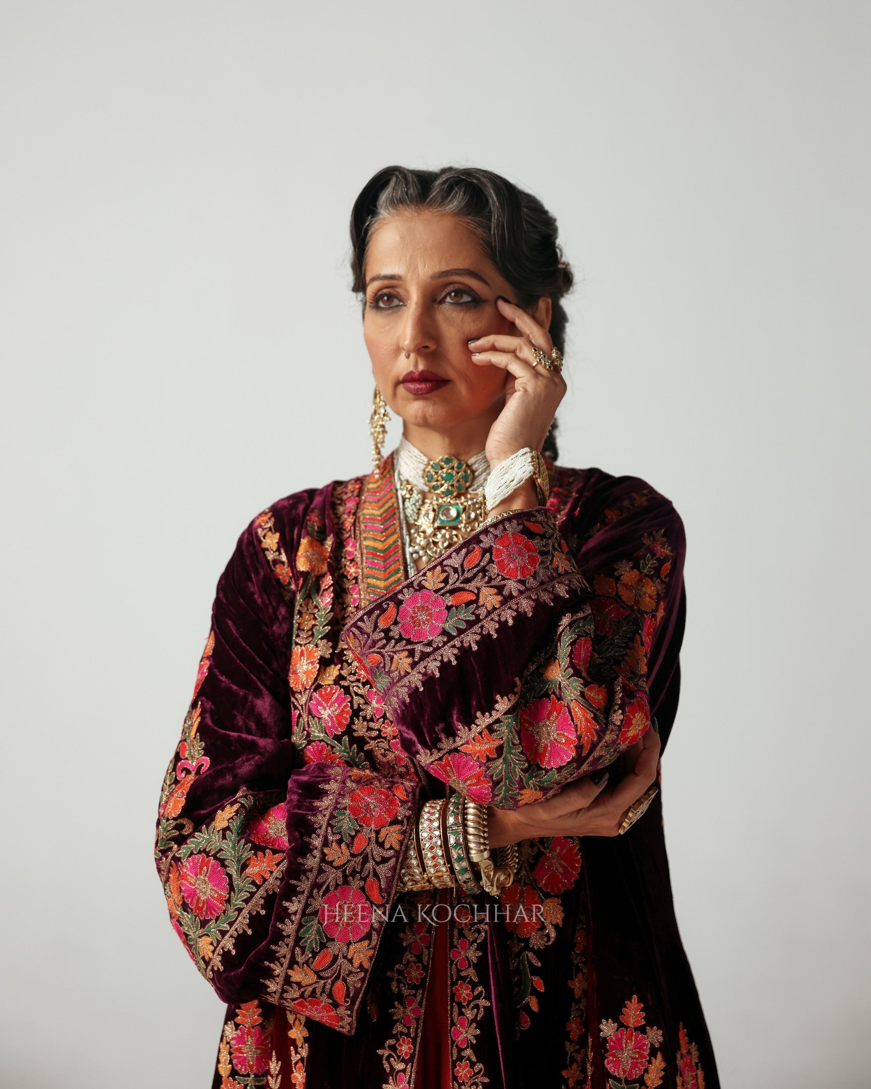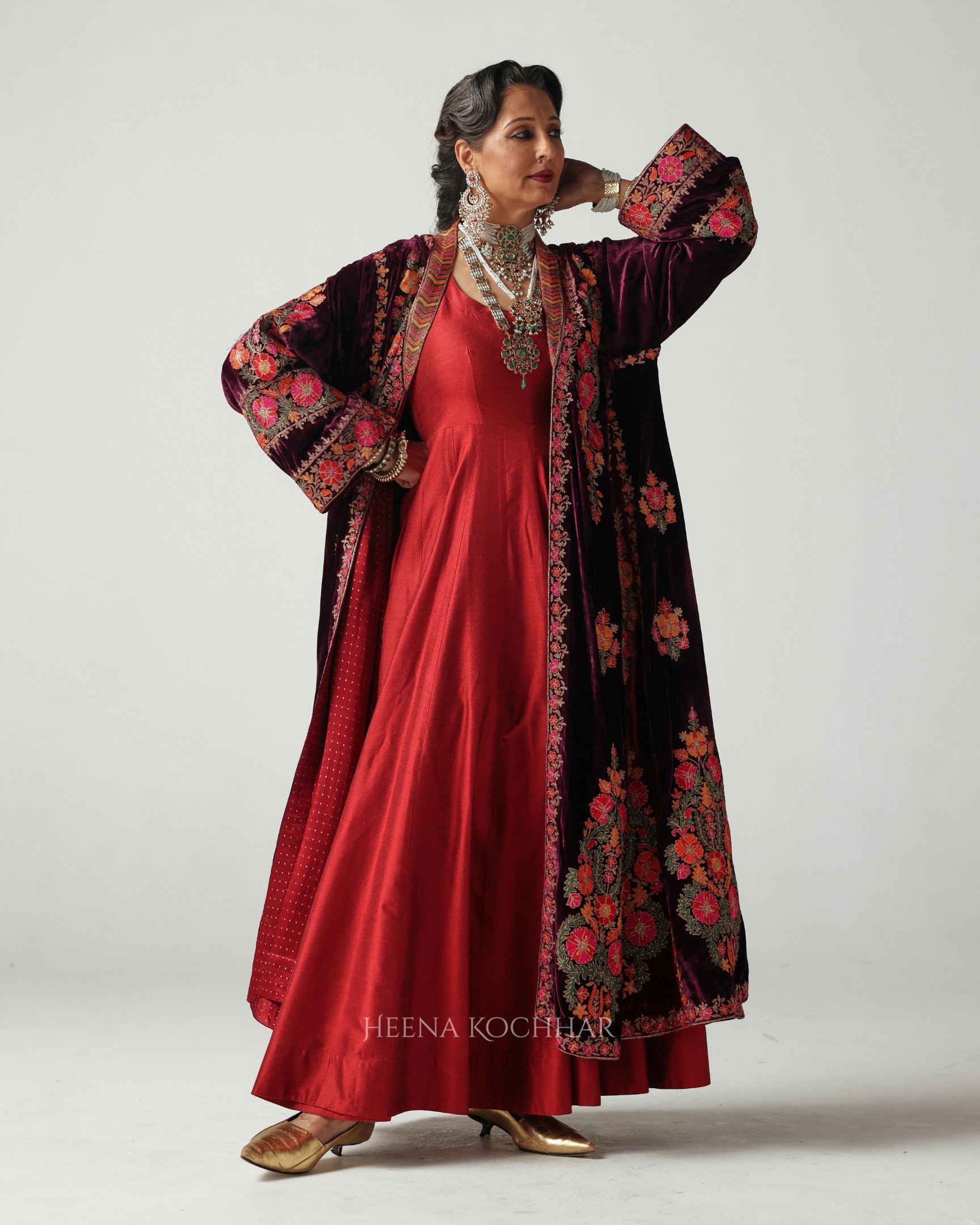 Paired with a maroon chanderi anarkali and chudidaar, the look brings together heritage and elegance, making it perfect for festive evenings with a touch of royal charm.