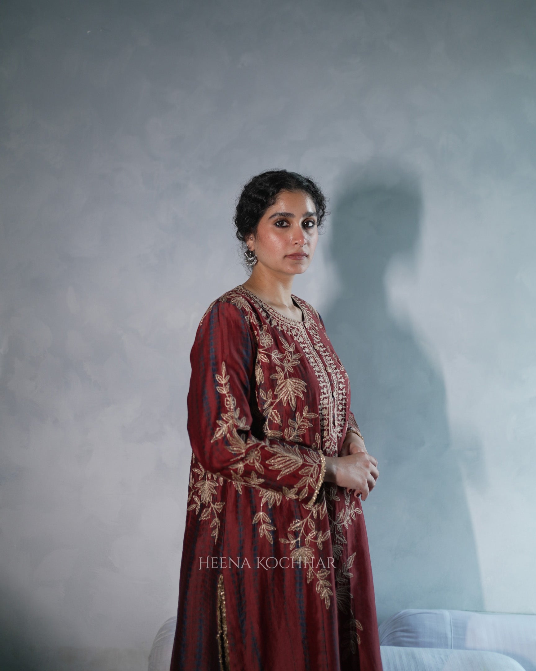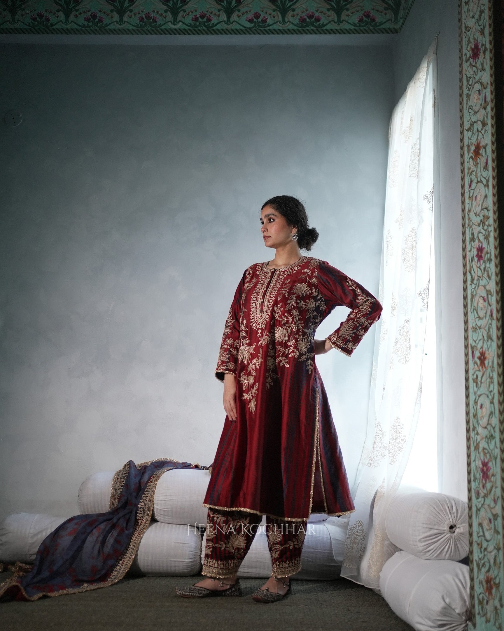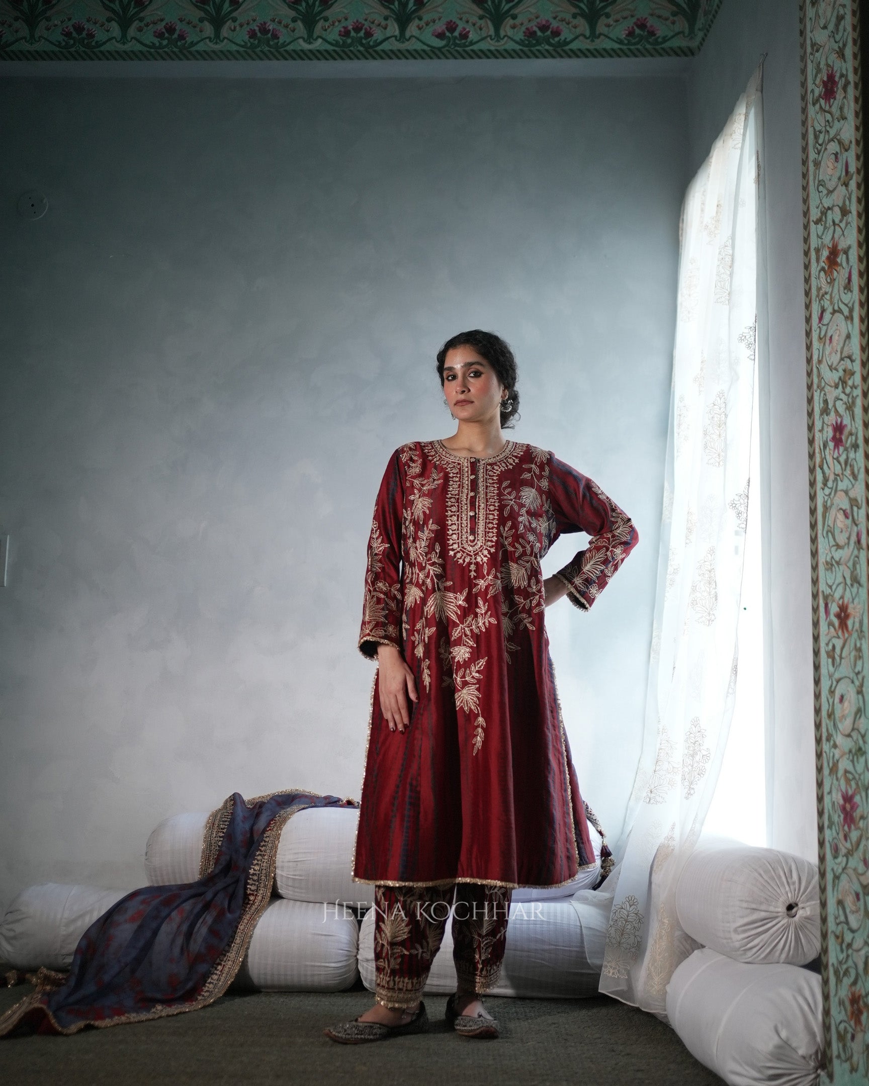 KURTA - Maroon And Blue Tie - Dye Chanderi Kurta