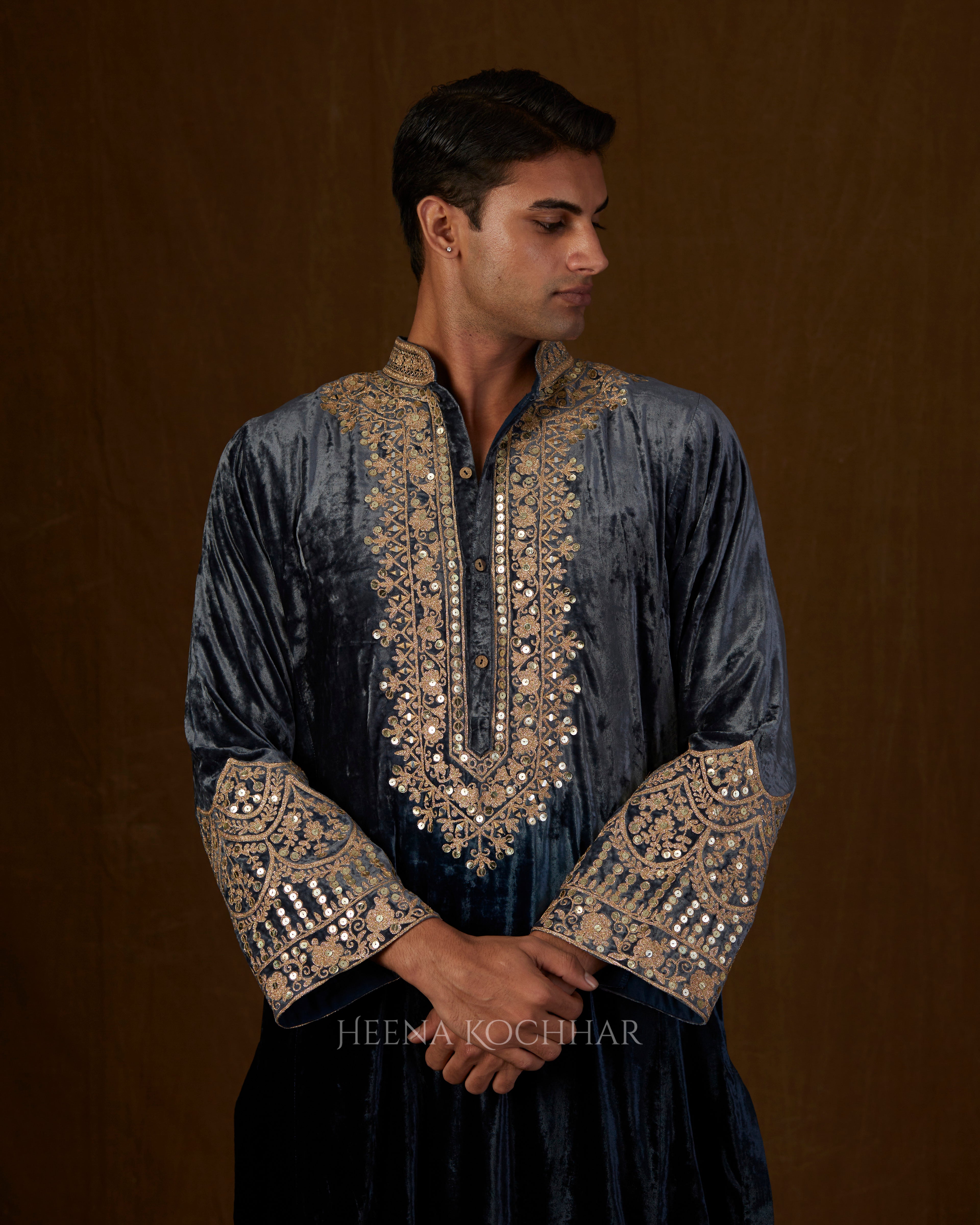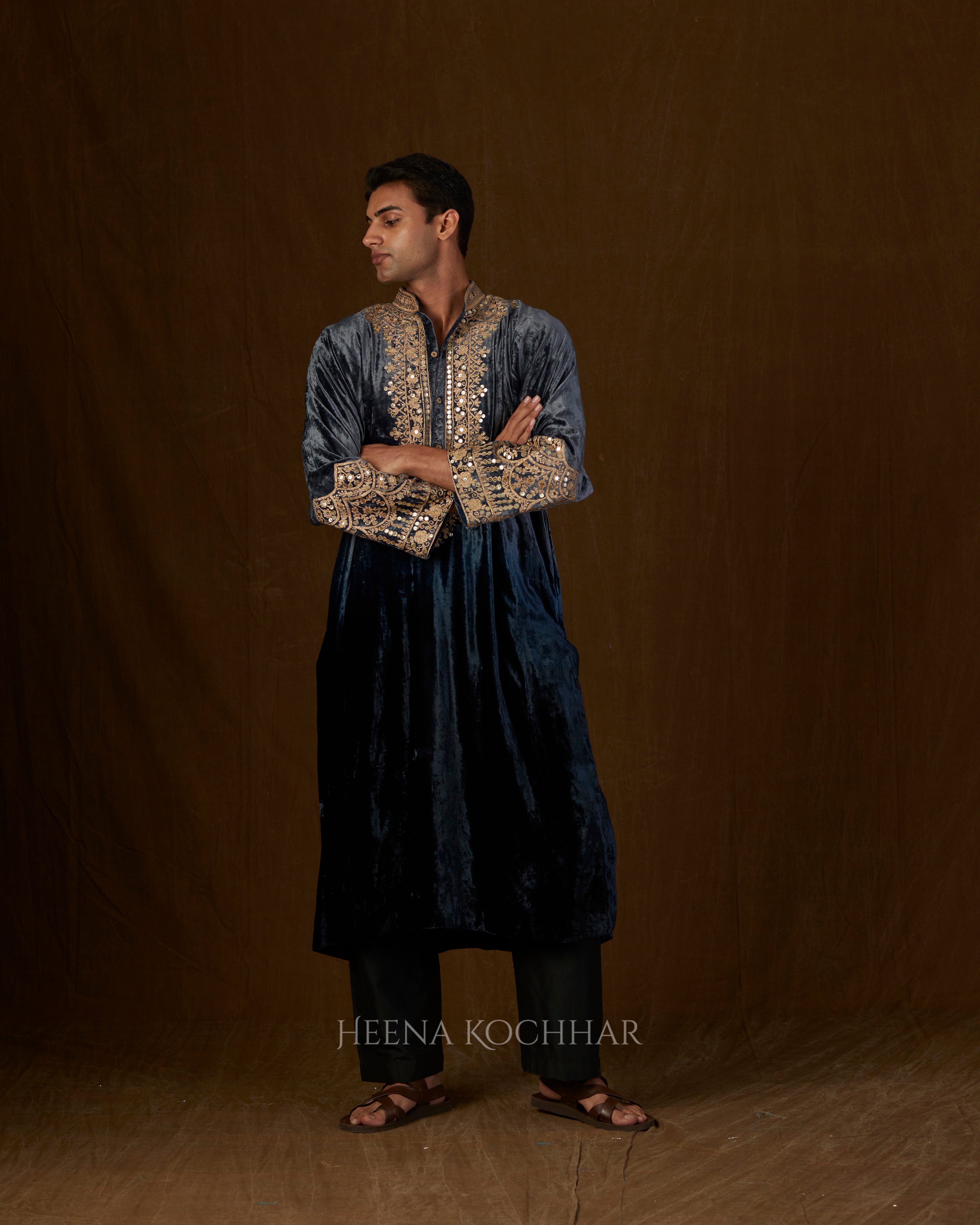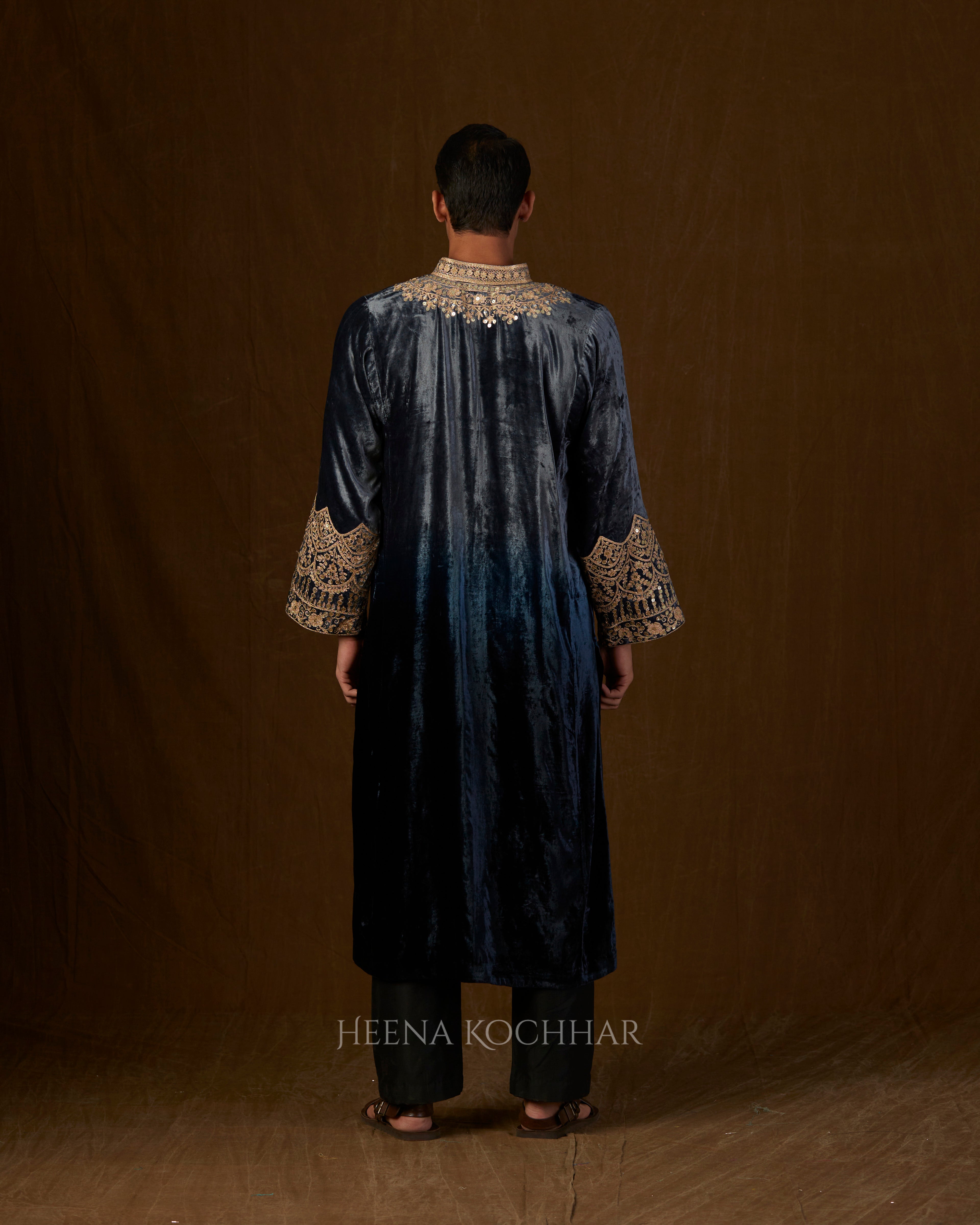 KURTA - Teal Grey Ombre Silk Velvet Choga