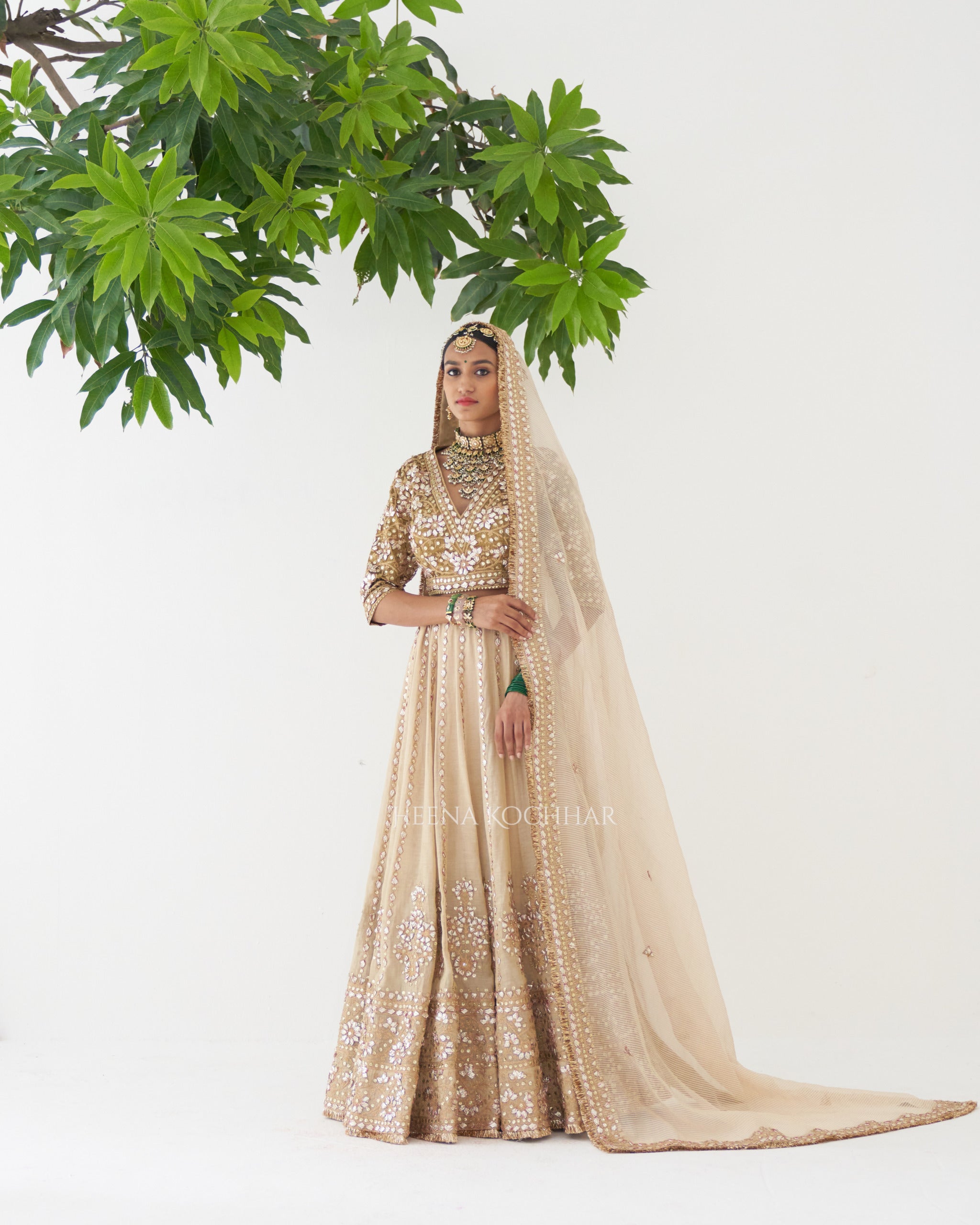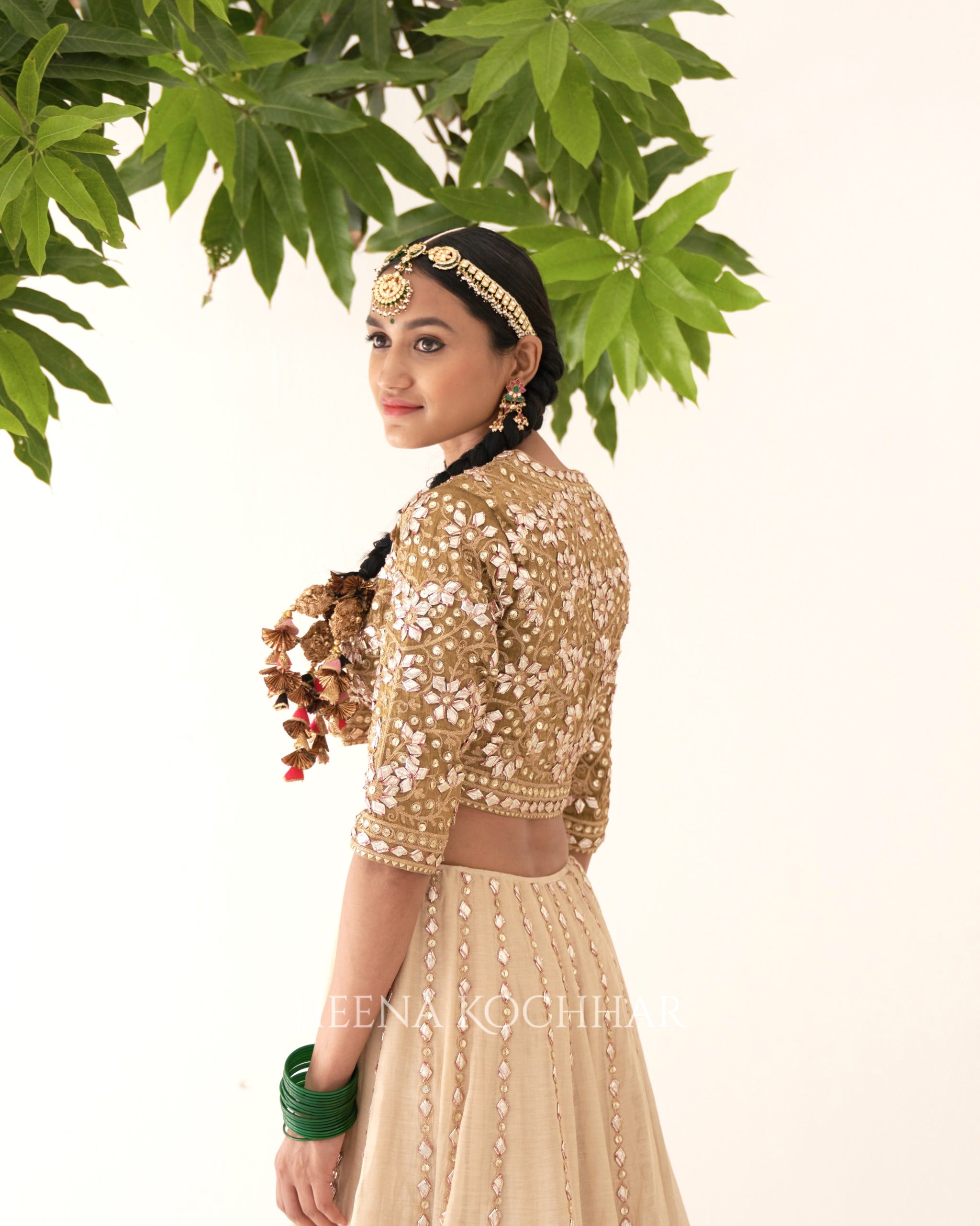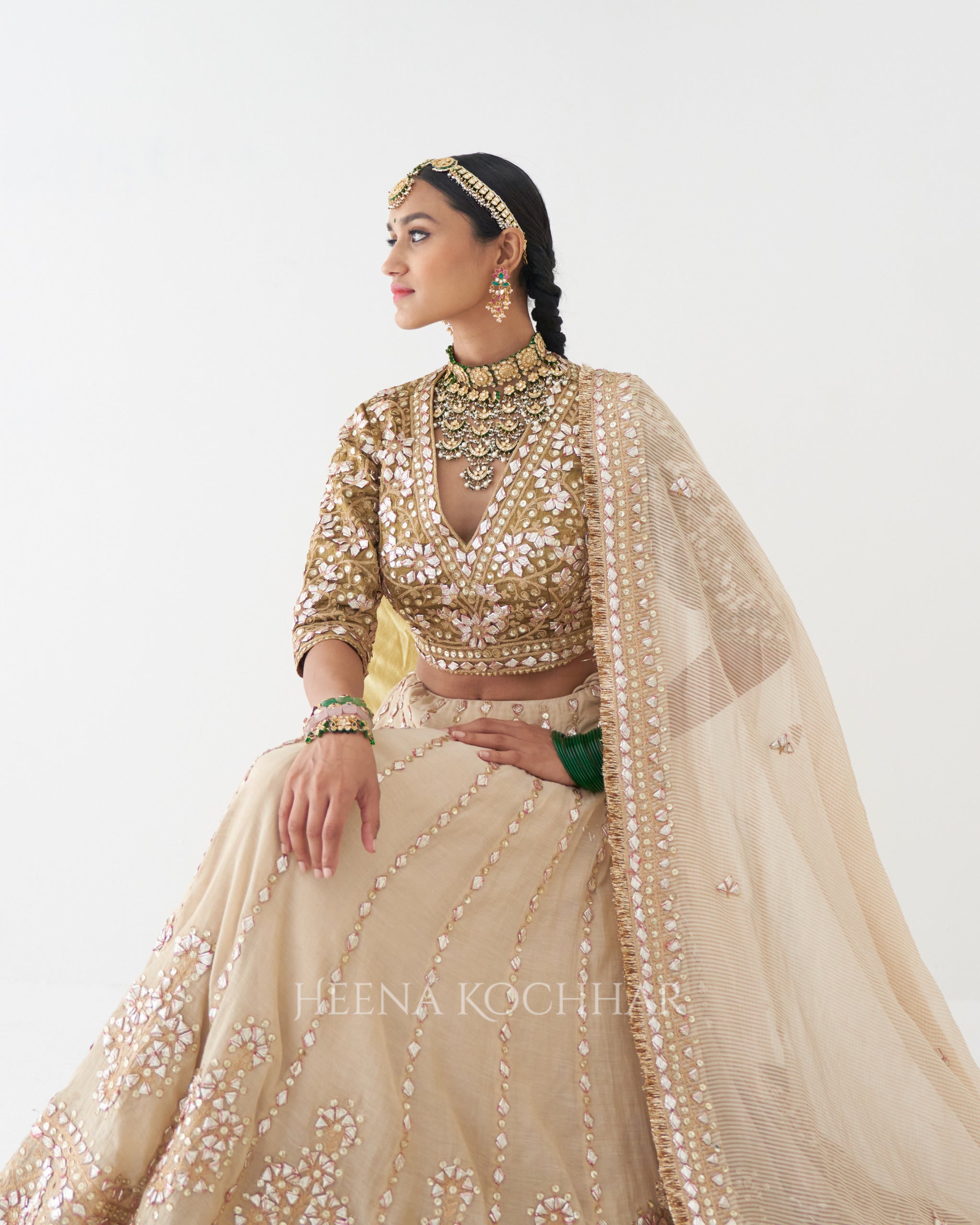 BOTTOM: Handloom tissue soft beige gold lehanga with drawstring waist and gold and silver gota ari emb