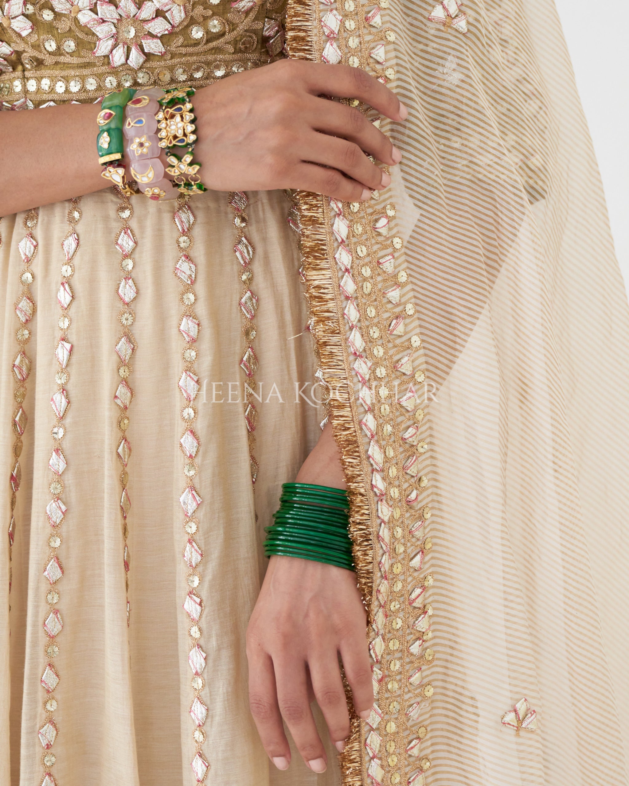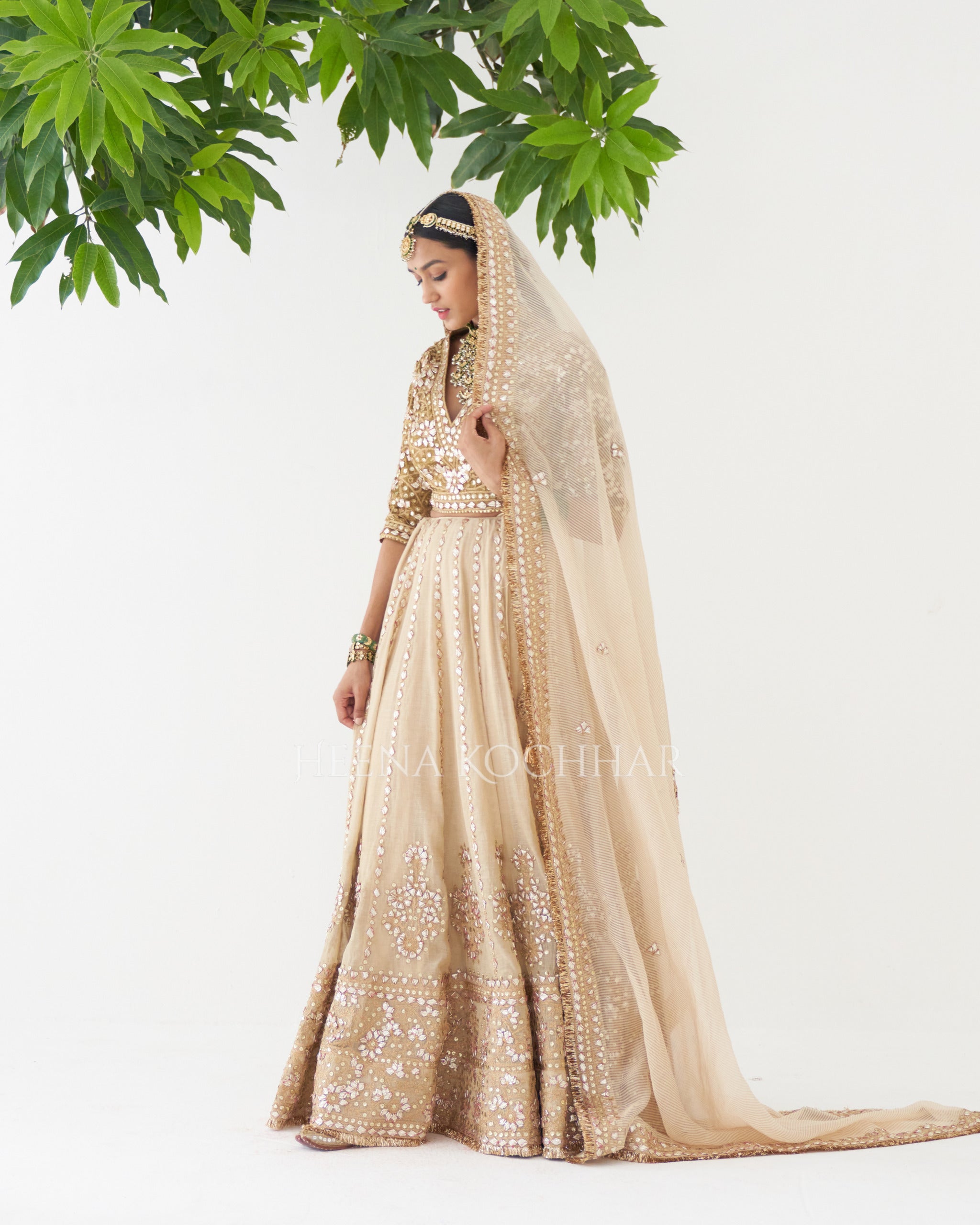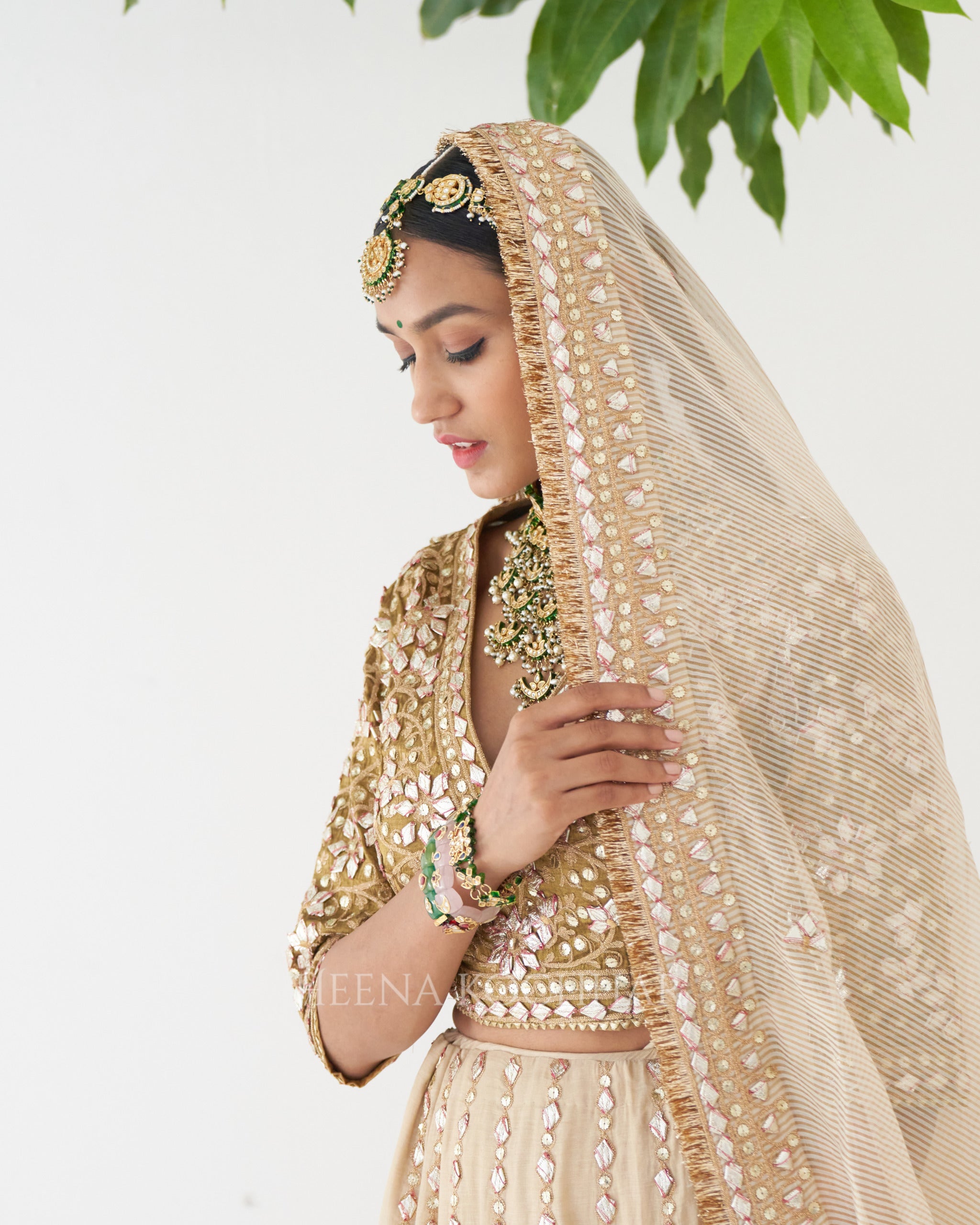 BOTTOM: Handloom tissue soft beige gold lehanga with drawstring waist and gold and silver gota ari emb