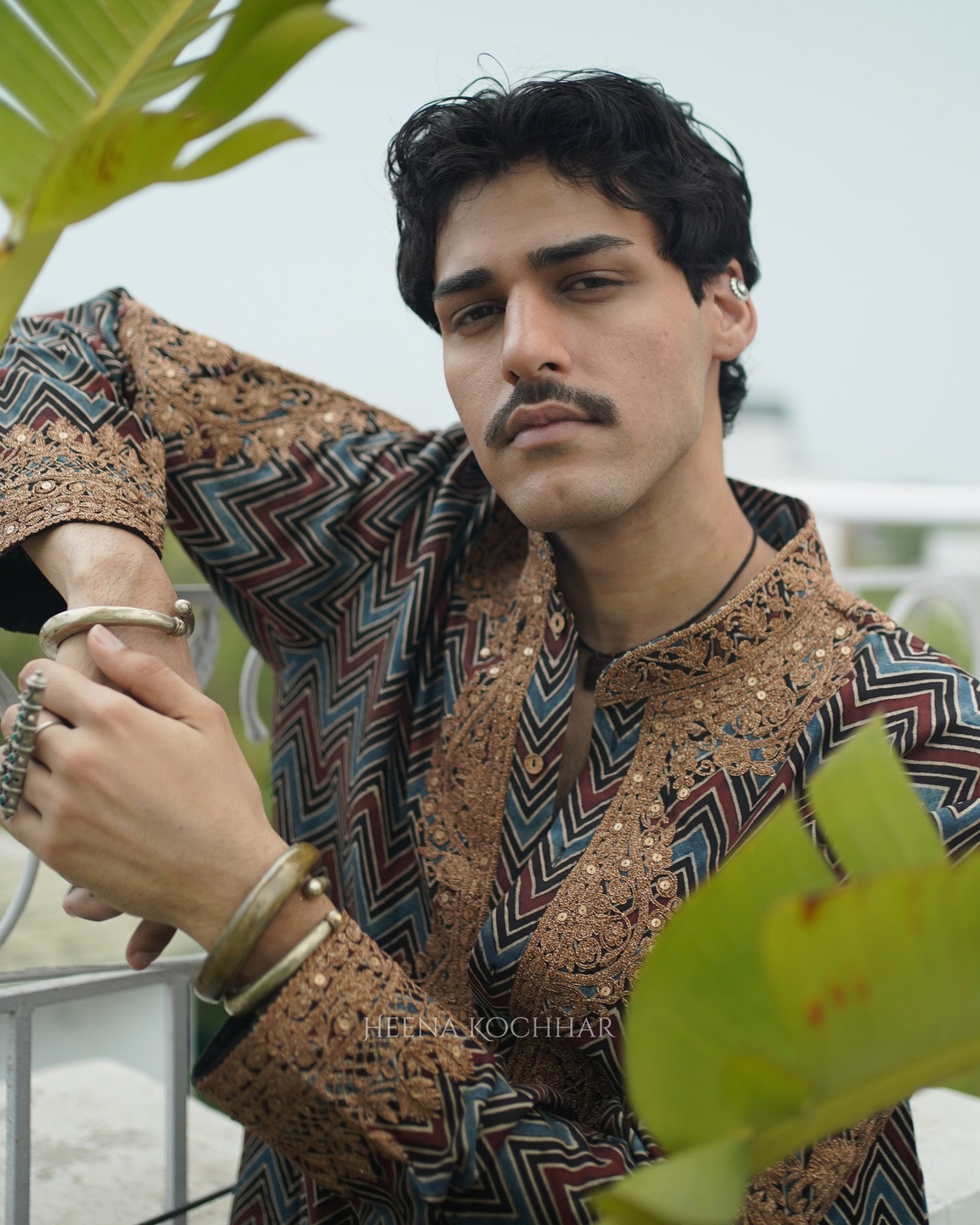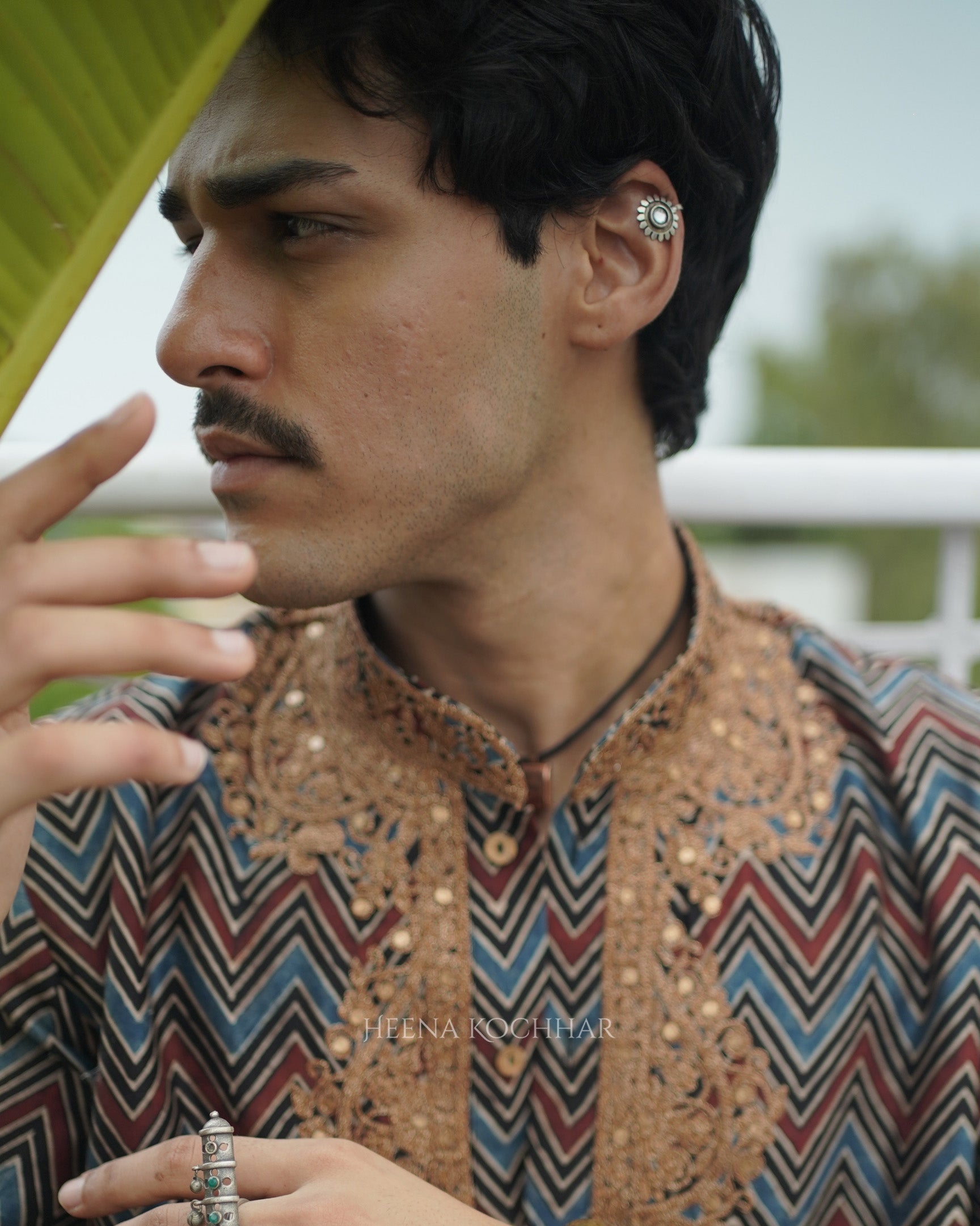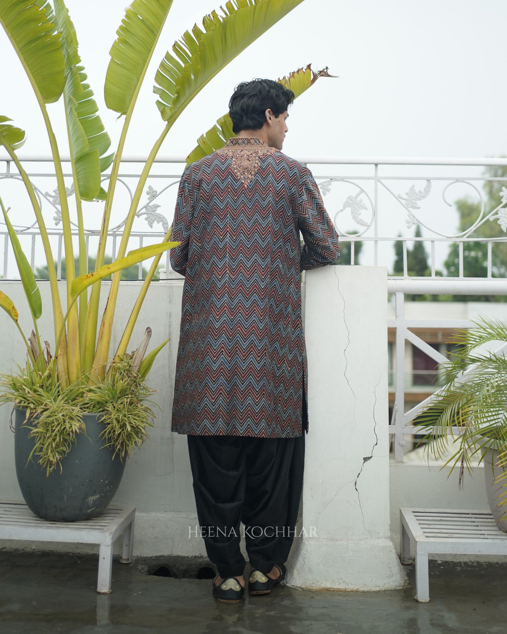 KURTA - Maroon And Blue Ajrak Chanderi Kurta